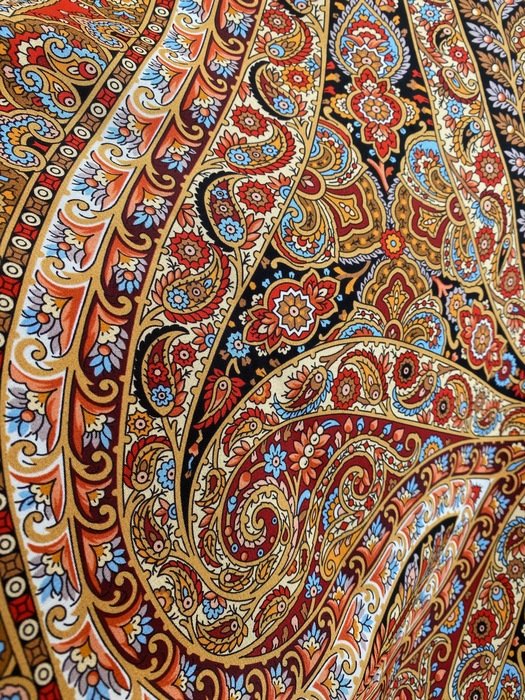 Представляла его темным и рыжим. На самом деле все не так. Оттенки очень нежные. Теплая , коралловая гамма, дымчатый нежно-сиреневый, вместо алого--красный ,светлый коралл, коричный, голубой. Оранжевого нет. И все это на черном поле. Прелесть!