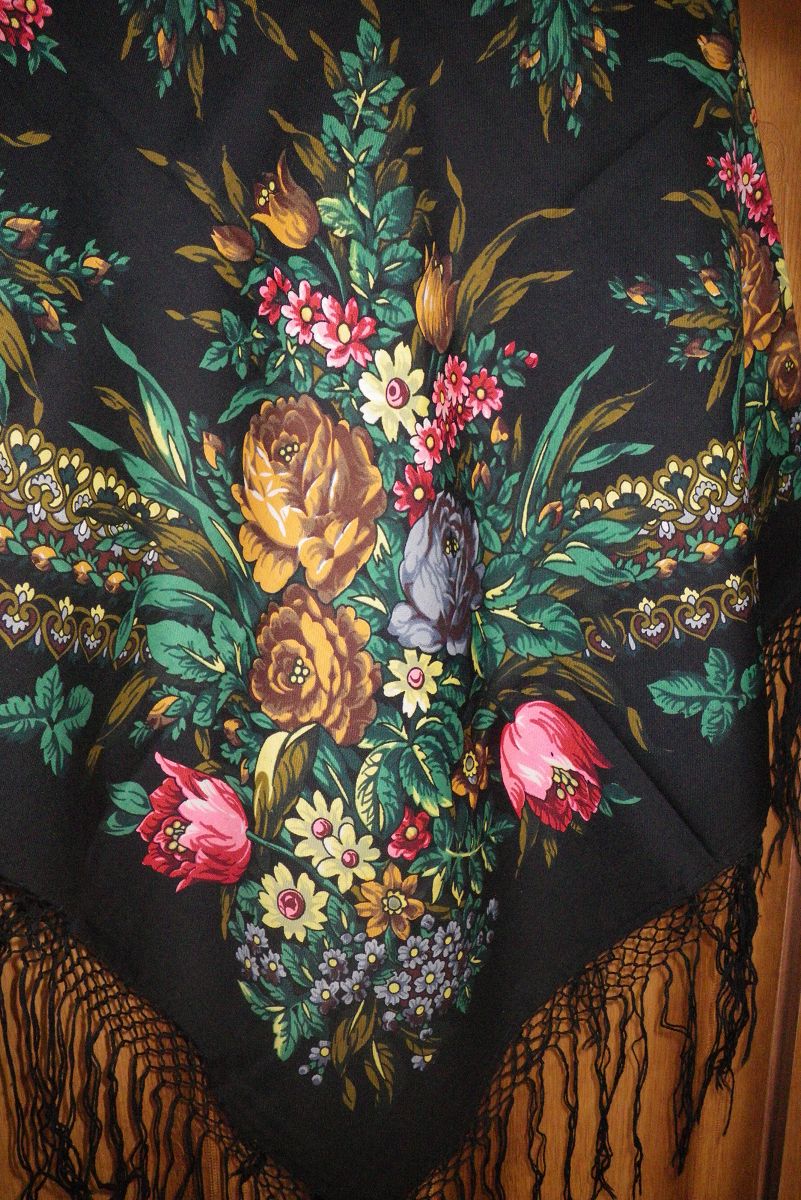 И, напоследок, шаль 150х150 с шерстяной бахромой клетками в пять рядов. Ткань шали плотная, более жесткая, чем на современных платках. Рисунок почему-то настроением напомнил мне Лунный свет Екатерины Регуновой - те же тонущие в темноте длинные изумрудные и коричневые листья.