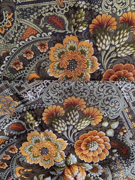 Такая разная печать Терема расписного-2. Впечатление, что фото сделаны при разном свете ( справа-электрический) , но это не так. Везде яркий дневной свет, это платки разные.