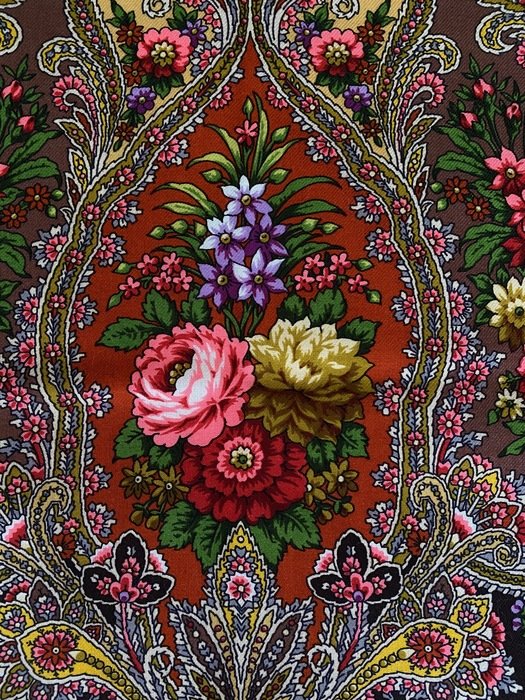 Яркий, контрастный, насыщенный, светящийся--это все о нем. Немного разный при разном освещении дневного света. Иногда выдает фломастерные нотки, особенно у цветков, как будто они подсвечиваются ( этот факт очень понравился). Самое красивое в нем --цветочные "капли" по кайме, очень заметные. Цвет каймы--горький шоколад, на солнце отливает светлым розово-коричневым, а в тени почти черно-коричневый. Оттенки желтого различные: бледная, зеленоватая охра (цвет зеленого золота);окошки--яркий желтый, что то между желтком и лимоном; зелень также яркая, не натурального оттенка, "теплая" ( с желтым) зеленка; другие окошки--темное, темное, сиреневое какао.