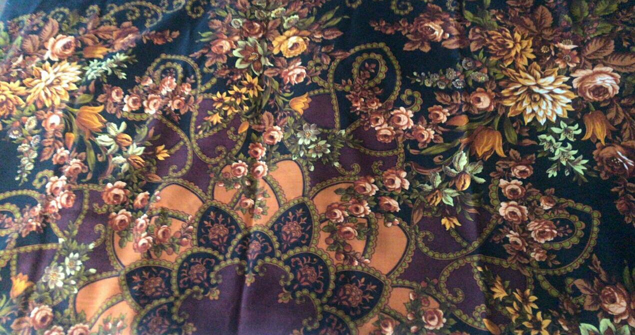 Яркий, контрастный, насыщенный, светящийся--это все о нем. Немного разный при разном освещении дневного света. Иногда выдает фломастерные нотки, особенно у цветков, как будто они подсвечиваются ( этот факт очень понравился). Самое красивое в нем --цветочные "капли" по кайме, очень заметные. Цвет каймы--горький шоколад, на солнце отливает светлым розово-коричневым, а в тени почти черно-коричневый. Оттенки желтого различные: бледная, зеленоватая охра (цвет зеленого золота);окошки--яркий желтый, что то между желтком и лимоном; зелень также яркая, не натурального оттенка, "теплая" ( с желтым) зеленка; другие окошки--темное, темное, сиреневое какао.