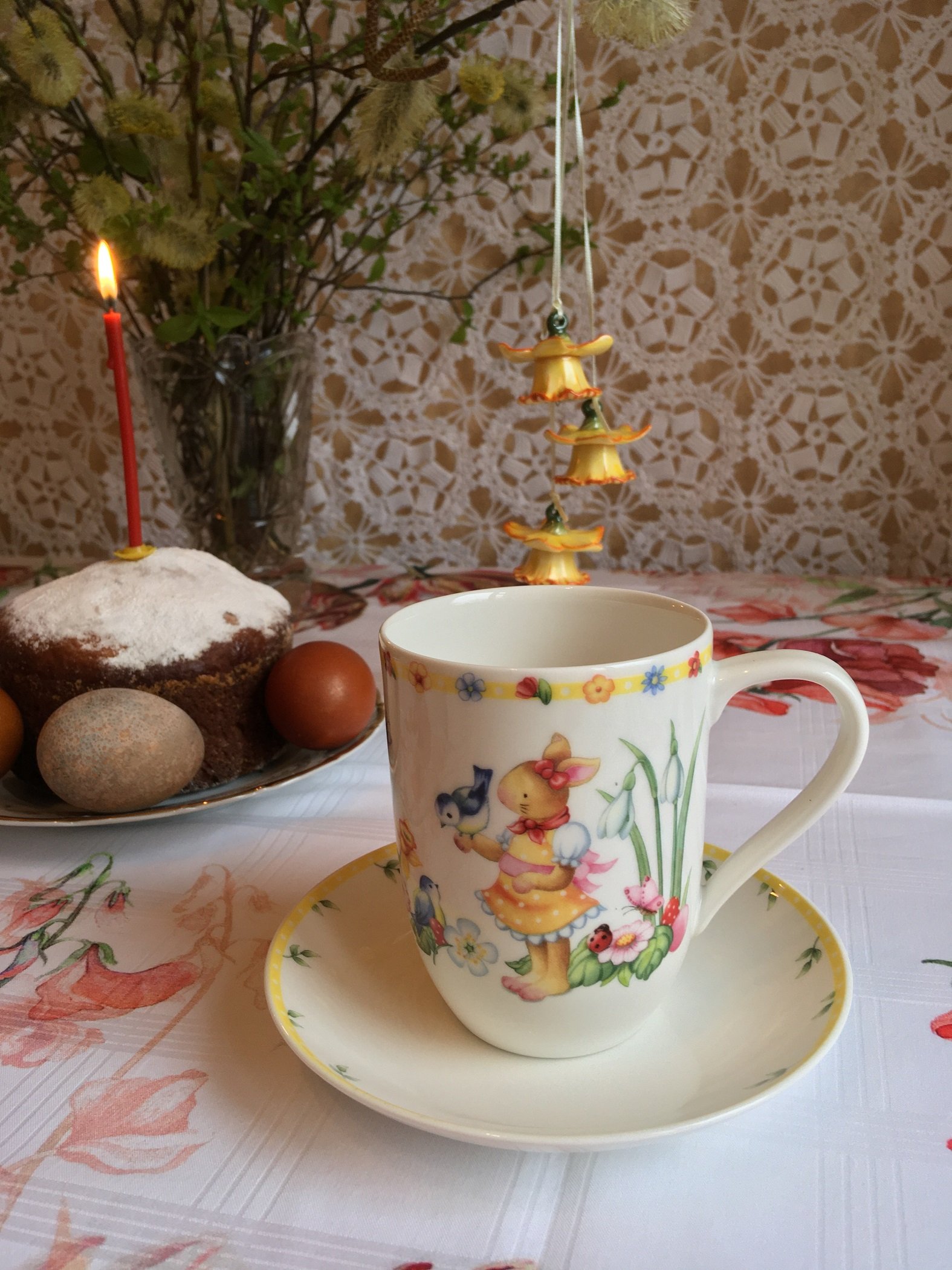Бокалы с блюдцами из коллекции «Farmers Spring» и фарфоровые пасхальные подвески «Нарциссы» (нарцисс - символ Пасхи и весны)