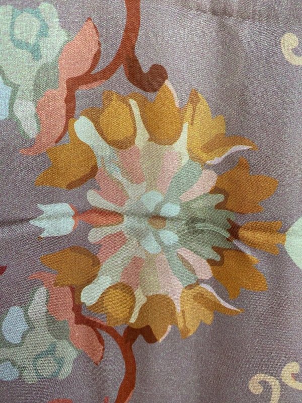 Очень нежной , летней расцветки . Легкий , большой и приятный. Буду немногословной--цветопередача верная. Скажу только, что мятного цвета в нем не много. Основной фон --темный серовато-бежевый, ближе к серо-коричневому, в теплый тон. При сильном увеличении--крапчатая фактура ткани, в перемешку: бежевый (основной цвет фона ) и мятный.