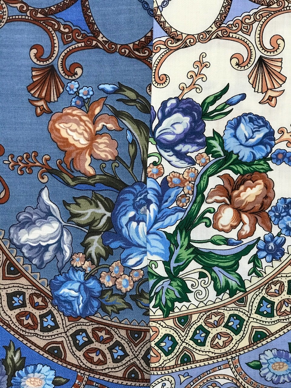 Согласна полностью, сама лето, поэтому имею все эти синие шали кроме Княжеского и Карнавала. Карнавал почему-то мне не пошёл настолько, что даже в коллекцию не купила. Причём и цветом, и рисунком.