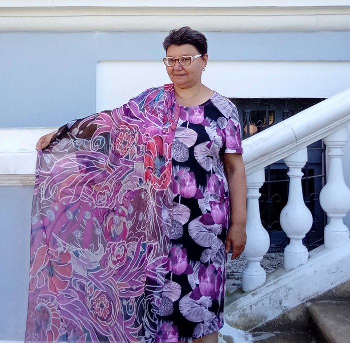 Очень идёт платочек из вискозы! Даже улыбнулись, видно, настроение улучшается, когда платочек к лицу!