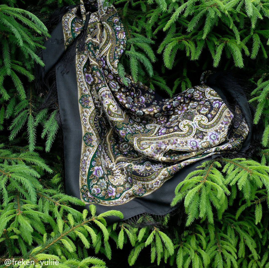 Таня, мерила еще синий и красный. Но, рисунок этого платка, понятно было и без примерки, очень похож на Женское счастье и Шиповник. Я выбрала для себя колорит, которого нет ни у Женского счастья, ни у Шиповника. Женское счастье по восприятию на человеке, конечно идёт другой строкой, всё-таки шаль, а вот Шиповник в намотке на человеке очень похож на Запах мёда и роз. Синий и красный Шиповник у меня есть. А тёмно-зелёным пусть будет Запах мёда и роз.