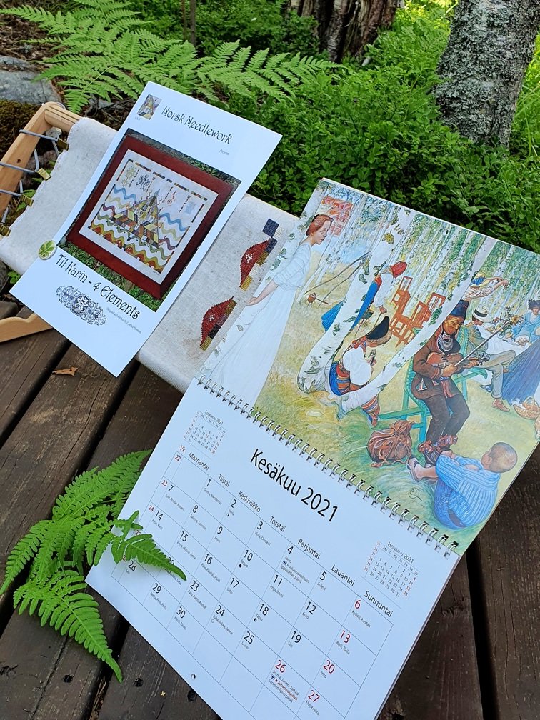 Летнее Рождество, или День летнего солнцестояния, или Солнцеворот, или Иванов день, или Иван Купала... В Швеции - Midsommar, в Финляндии - Juhannus. Кто спал этими короткими светлыми ночами? Не знаю. Пока соседи прыгали через костры, плескались в озере с русалками и бродили среди берёз и папоротников в рассветном тумане, я вышивала "Til Karin - 4 Elements" от Norsk Needlework. Прекрасная адаптация для вышивки крестом мотива гобелена шведской художницы Карин Ларссон. Решила стартовать именно сейчас, хотя пары цветов ниточек TGA по ключу не хватает, но в процессе либо найдутся, либо замену подыщу. Лён 35ct с принтом "старая бумага". На втором снимке - "угадай платочек", на третьем - финский календарь 2021 с репродукциями картин Карла Ларссона. Июнь - "Завтрак на открытом воздухе. 1910-13"