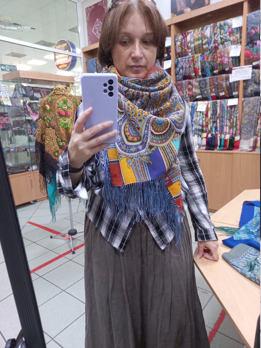 Не пожалела ,что заказала и думаю --не ошиблась в 52 колорите. Он просто ,сам по себе самодостаточно сказочный! А синий какой колокольчиковый--прелесть! Одно мне не нравится -- бахрома. Думаю, что скорее всего--сниму.