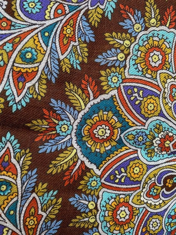 На фотографиях часто получается резким и чрезмерно ярким. По первому впечатлению--весь в целом, платок не оранжевый и не желтый. Он --голубой! Тона и полутона...Голубая синь, фиолетовые колокольчики. Самый светлый, голубой на кайме-- холодного чистого тона, льдистый и насыщенный. Мне показались все цвета синего--чистые, без примесей оттенков и "сложности". Красочный!