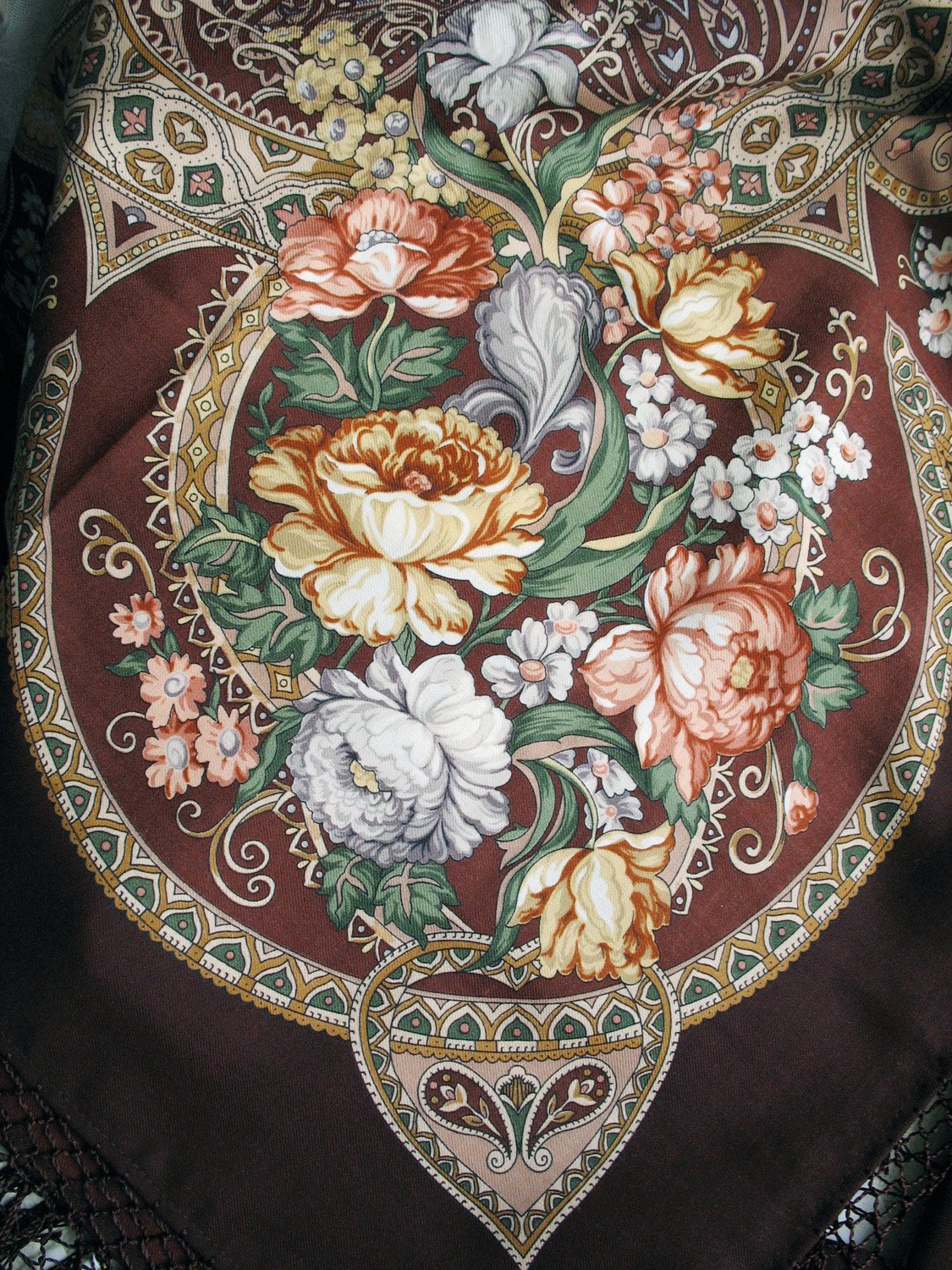 Зелёный совсем не яркий. Возможно камера чуть усилила зелень, но если только чуть. Мне нравиться, она оживляет, без неё было бы блекло на мой взгляд. Всё цвета смотрятся очень гармонично. Кстати, серые цветы вовсе не серые, серо-сиреневые(или лиловые? ) очень сложный цвет, камера не передала его. Мне эта шаль очень понравилась. Спокойная, элегантная, шоколадная) .