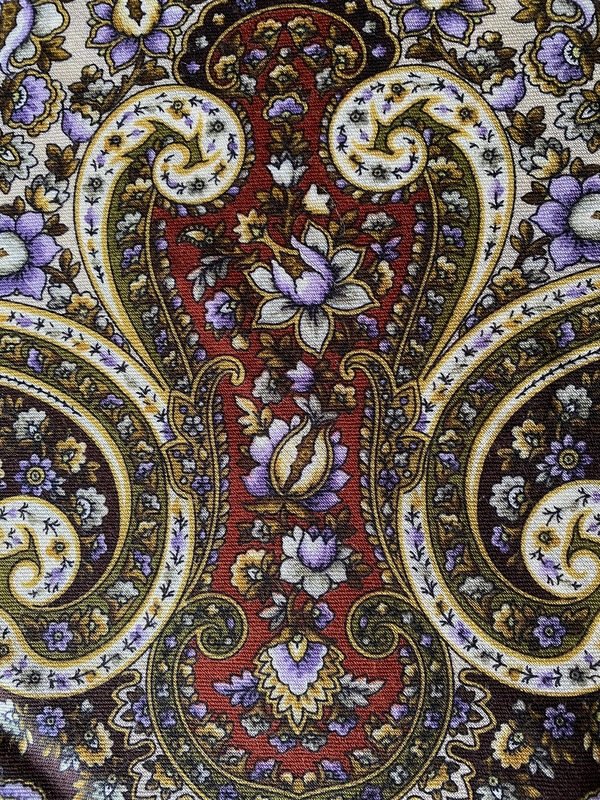Кайма теплой , зелено-серой оливки, только на фото упорно уходит в серый. Верный цвет каймы получается редко-- при сильном приближении камеры. Оттенки коричневого действительно медовые: красноватые, темно-коричневый (гречишный мед), (Кликните, чтобы почитать оффтопик)... желтые, охристые. Кирпичного цвета нет. Назвала бы --красно-коричневый, оттенок темной меди ,ржавый ( на фото он немного светлее) . Цвета сочные, но на фото платок ярче. Зелень густо травяная, насыщенная. Самый светлый цвет фона, в отличие от фото, где он кажется льняным ^! , на самом деле тепловатый, ванильно -масляный с едва зеленцой, очень светлый.