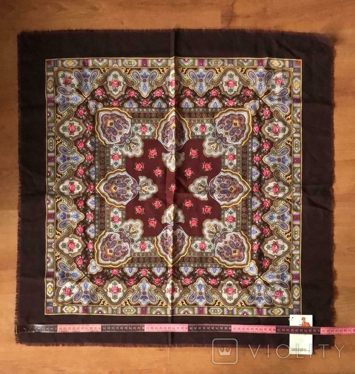 Любопытная у него маркировка, черная надпись по краю платка "Павловский посад". Отнесу в БС фотографии этикеток, бирок и прочего.