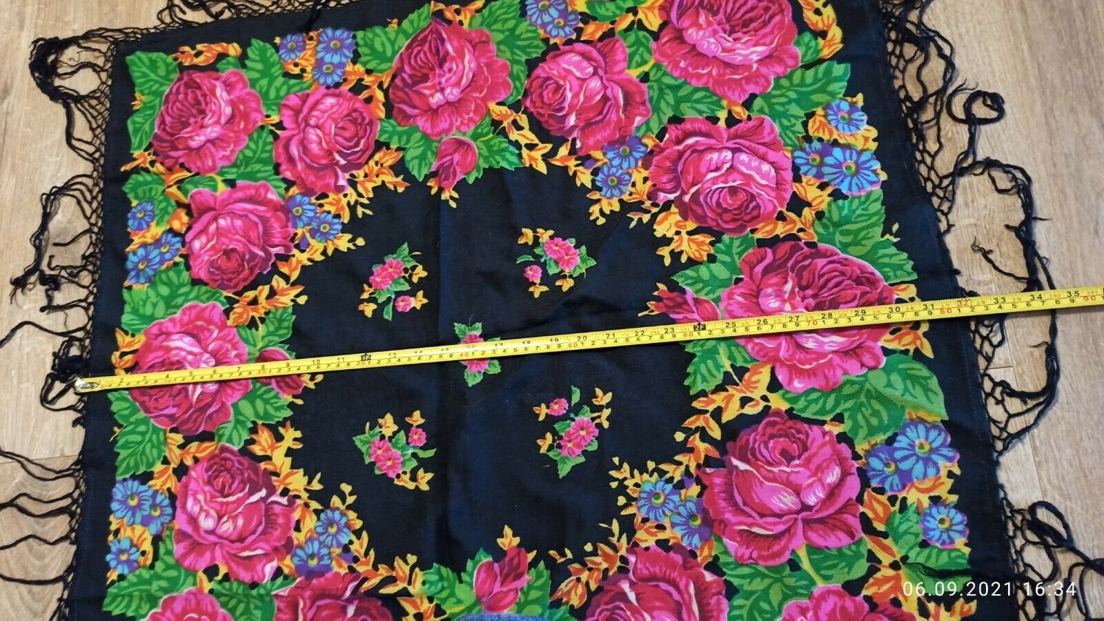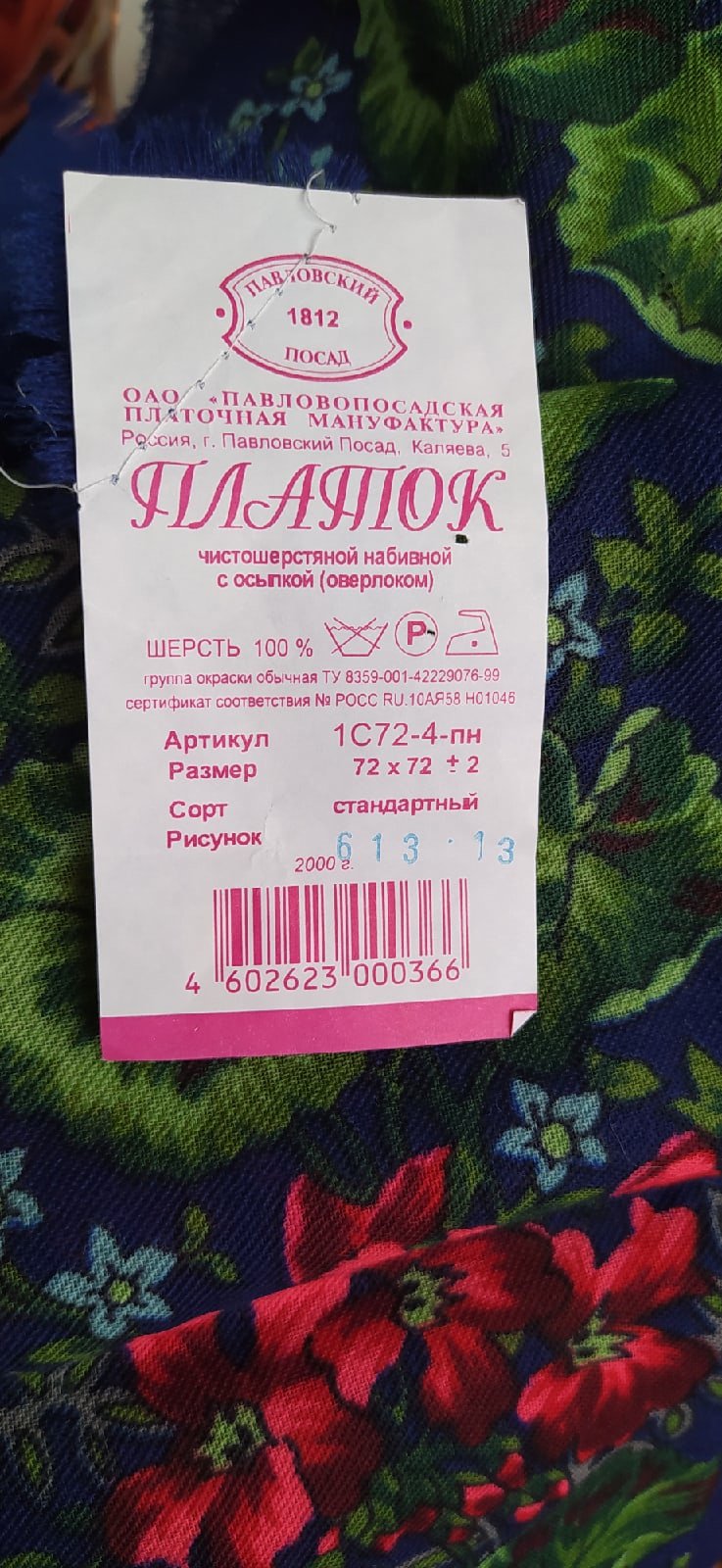 Любопытная у него маркировка, черная надпись по краю платка "Павловский посад". Отнесу в БС фотографии этикеток, бирок и прочего.