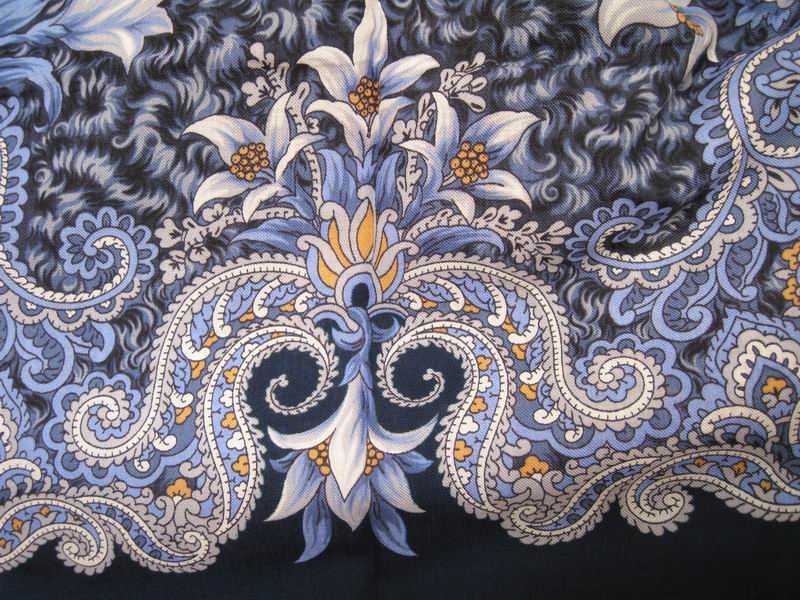 Этот платок "Сады Шираза" (855-7 размер 89х89 шелковая бахрома) еще есть на сайте, в печатном каталоге его нет. У него очень мелкий сложный рисунок, который трудно разглядеть на сайте, а жаль!