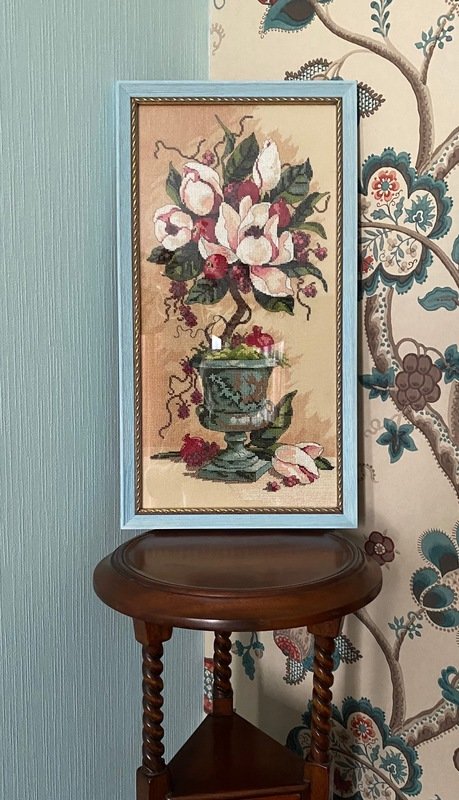 Королева Роза будет располагаться в интерьере между двумя позолоченными светильниками в тон рамки. Нити золотистого люрекса в вышивке подчеркивают этот цвет.