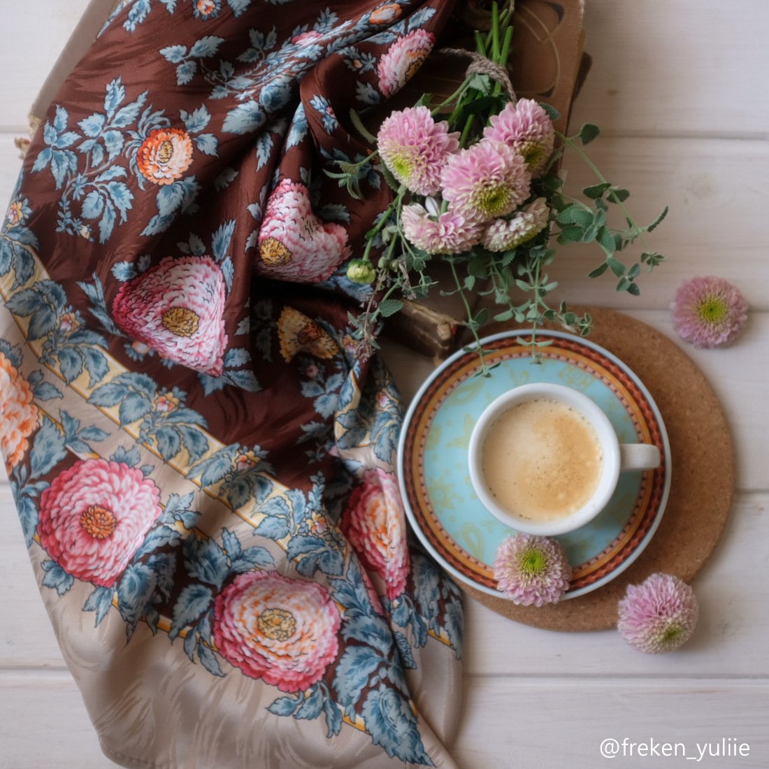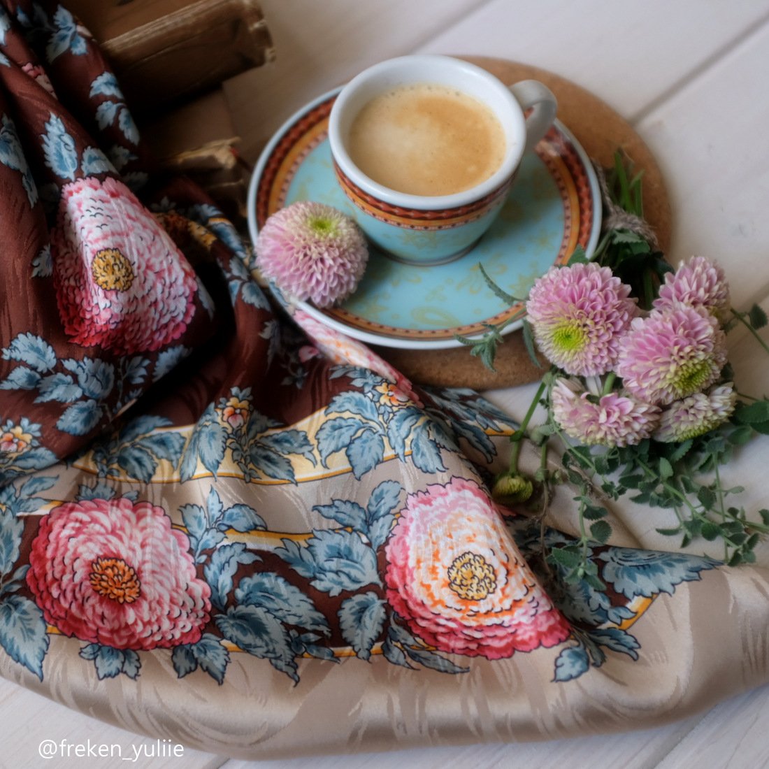 Нереальное совпадение цветов - живых и нарисованных (это георгины, хризантемы, или астры?). И чашечка - удивительная гармония по цвету!
