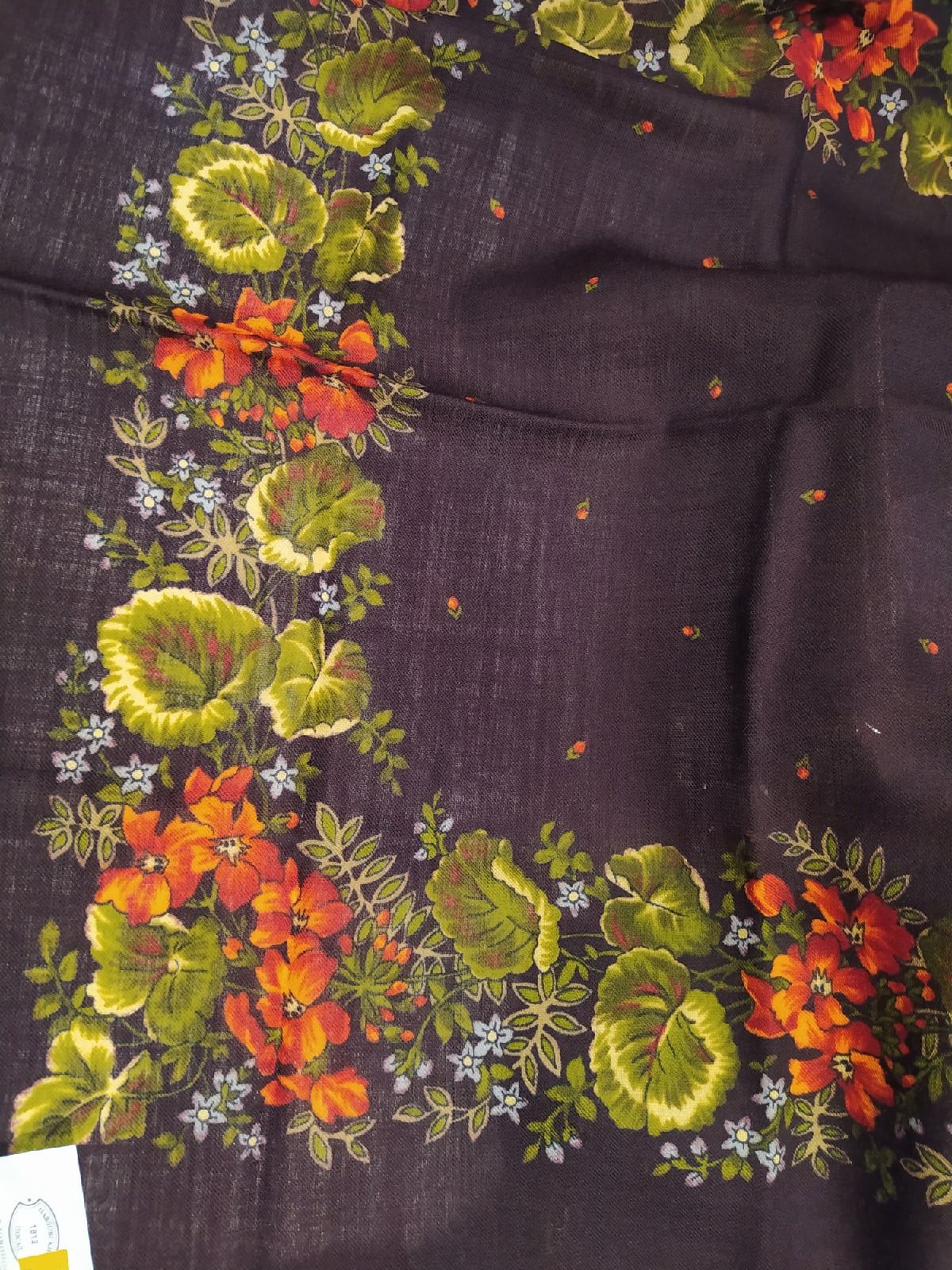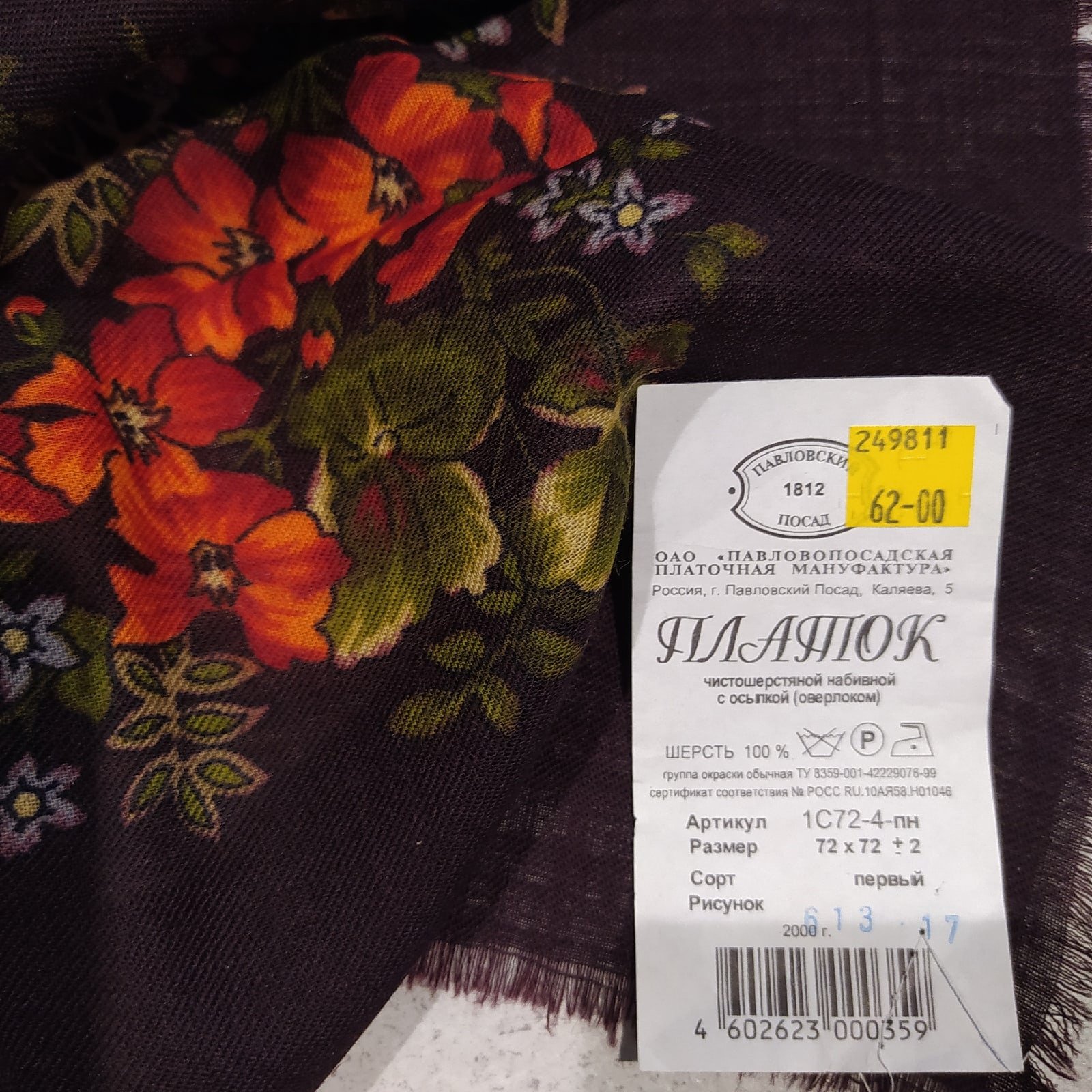 Любопытная у него маркировка, черная надпись по краю платка "Павловский посад". Отнесу в БС фотографии этикеток, бирок и прочего.