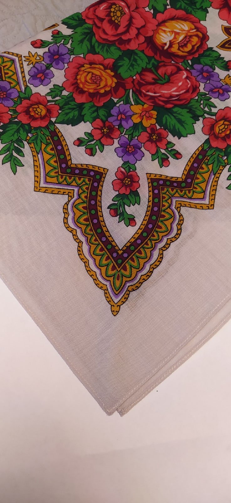 Очень достойный платок. Снято при пасмурной погоде. Никак не удалось поймать персиковый середины и обводки, на фото они получаются желтыми.