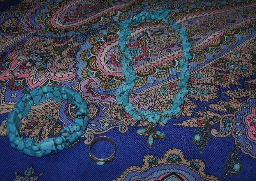 К сожалению, бирюзовых пп платков в чистом виде у меня нет. Есть синяя гамма платков ("Восточная сказка"-13 , "Ивушка"-4 и др. ) Но бирюзовый цвет люблю, много одежды данного колорита и украшений из бирюзы.