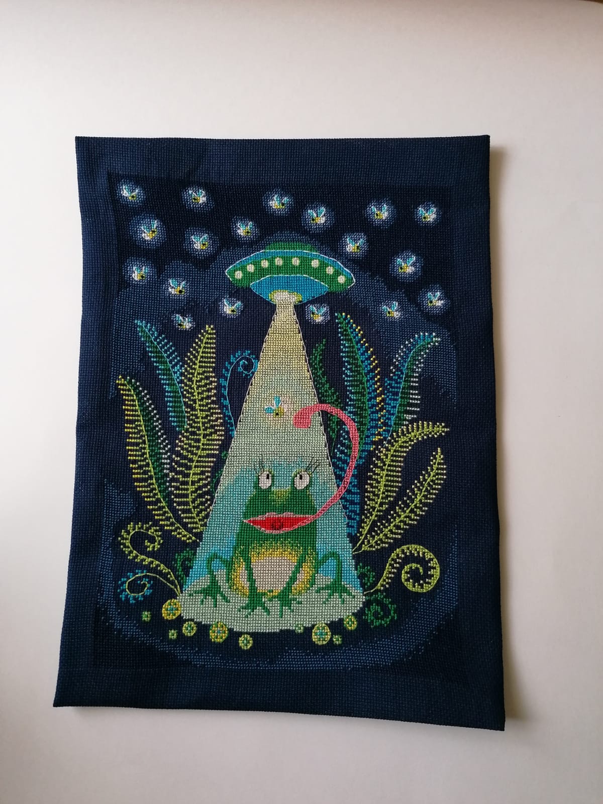 Покажу вышивку , которую ещё весной завершила , тут использована люминесцентная нить в комариках , в окошках нло ...