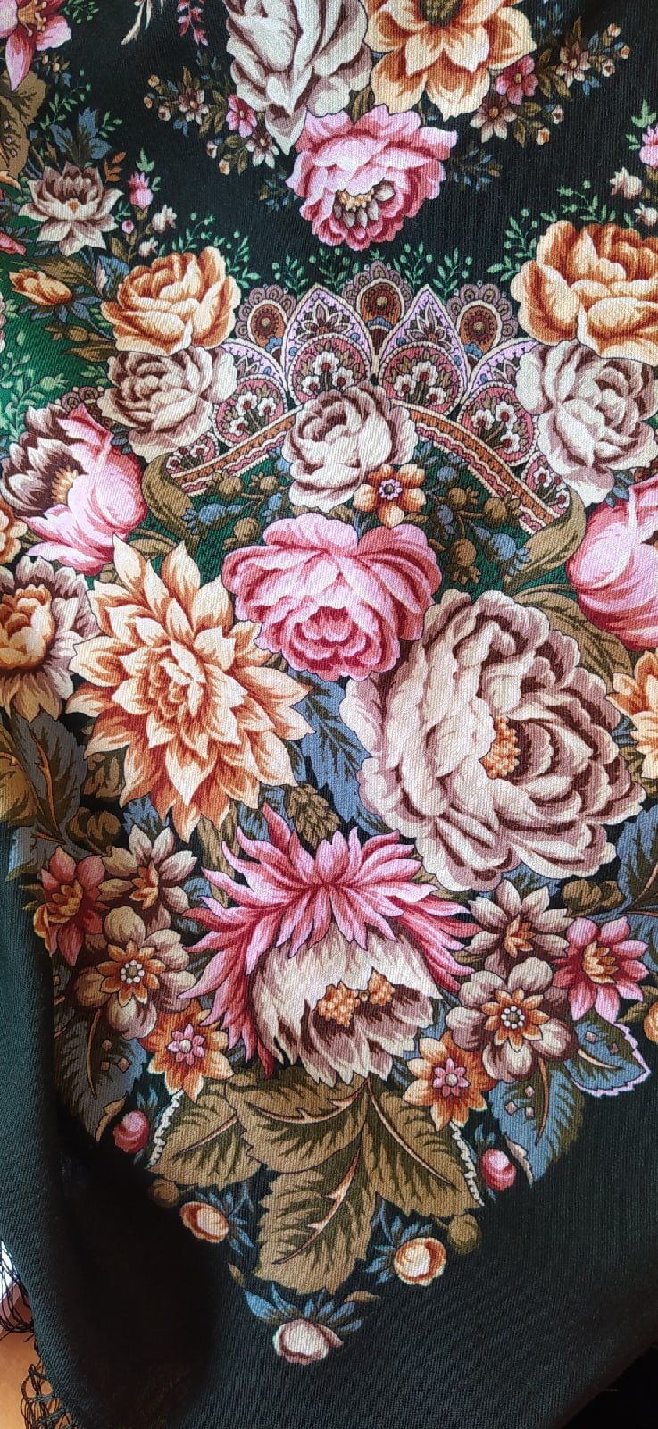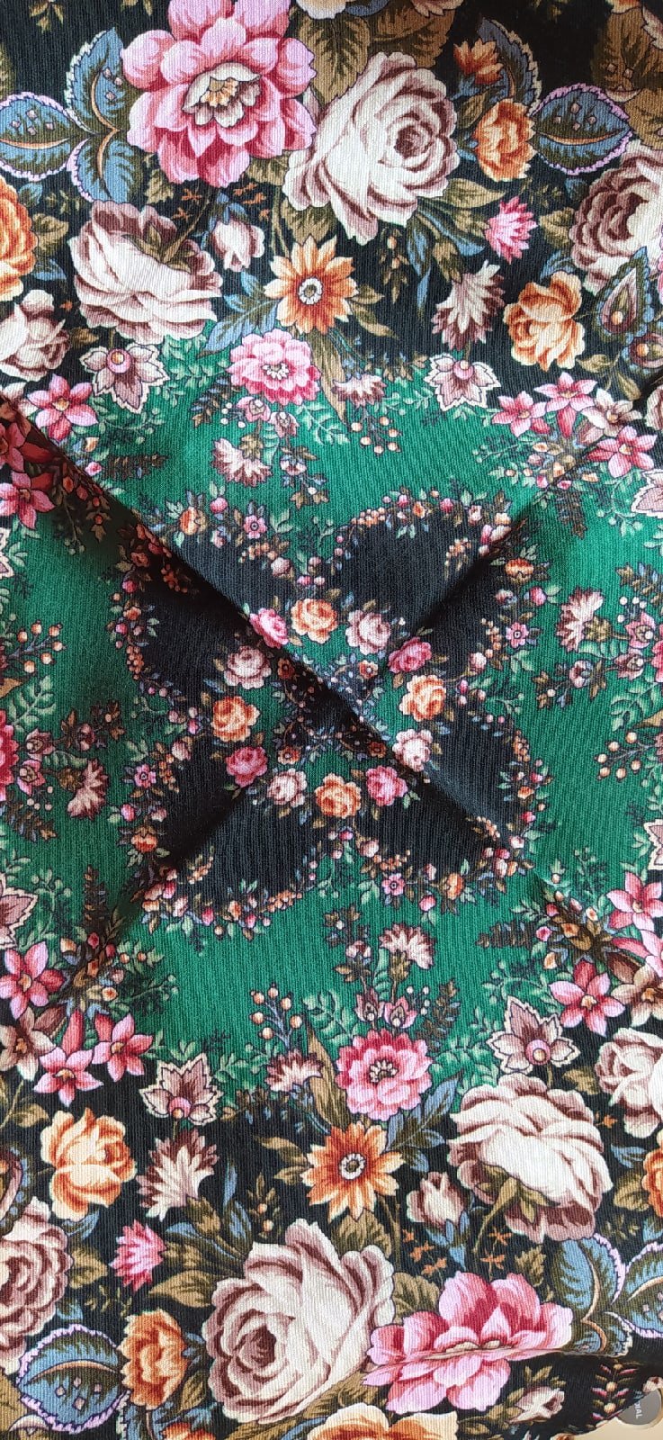 С зеленым цветом у меня сложные отношения. Есть "категорически нет" оттенки, а некоторые тянут в омут. Не думала покупать этот платок, пока не увидела в магазине. Мало показов и фото в архиве, добавлю немного деталей.