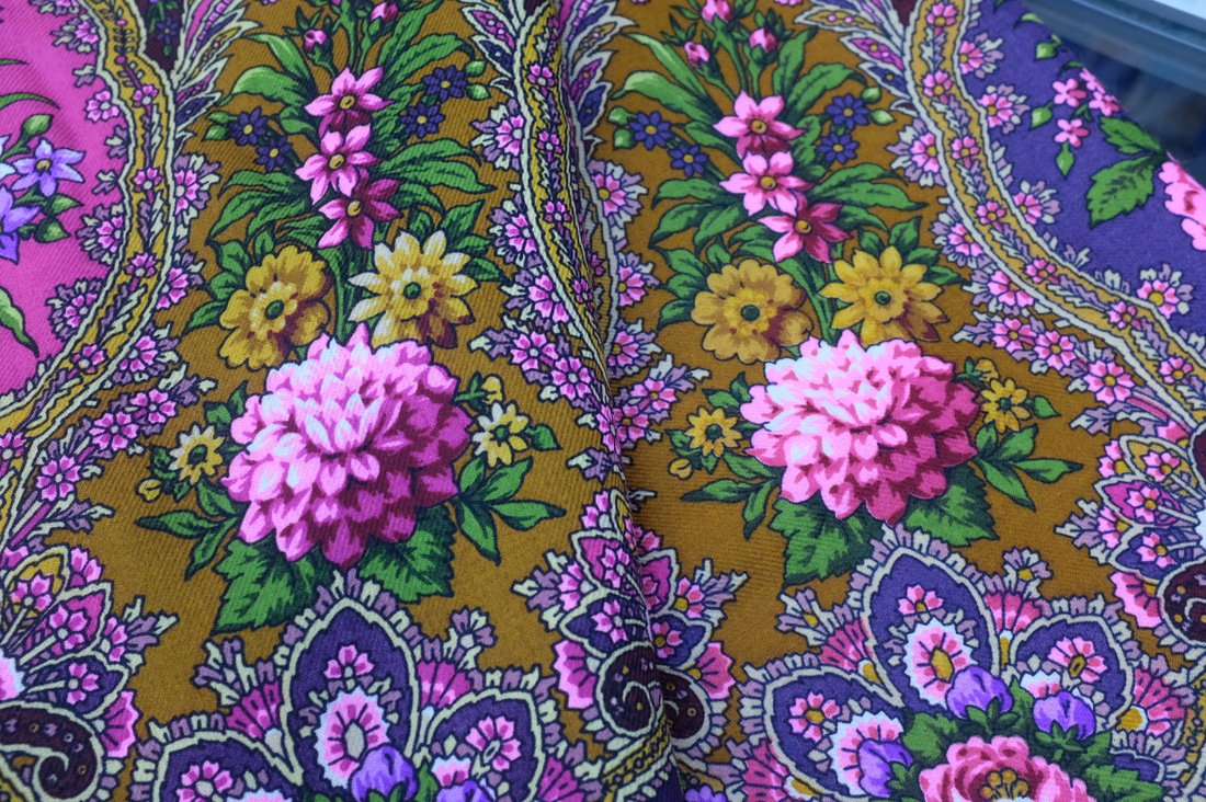 Девочки, спасибо всем за внимание. Казачка, и правда очень удачно переиздана. Новая смотрится чуть светлее только из-за бежеватых цветочков - они на новой версии не имеют таких глубоких теней, как на старой. Но, по сути и смыслу, платок остался таким-же. Тёмный. В роспуск по спине смотрится величественно и роскошно из-за плавных вертикальных линий орнамента. В намотке - задорно-хулиганской, потому что тогда на первый план выходят гирлянды желтых розочек и лохматенькая шерстяная бахрома.