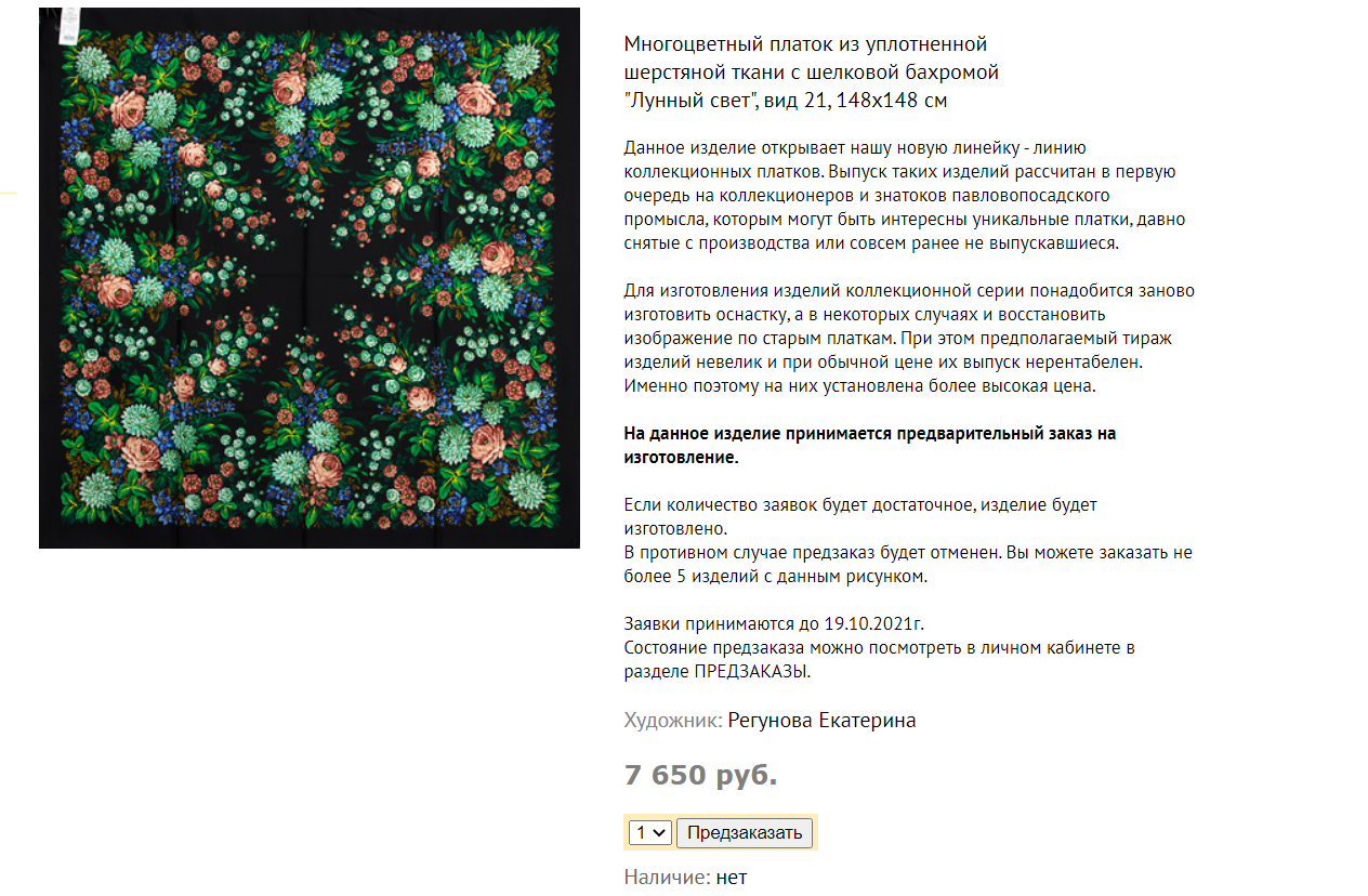 Предполагаемый тираж изделий коллекционной серии будет невелик, и уже сейчас понятно, что при обычной цене их выпуск мануфактурой будет нерентабелен. Именно поэтому на них установлена более высокая розничная цена. Просим вас отнестись с пониманием: это действительно необходимо, чтобы мы могли вернуть в ассортимент любимые всеми нами платки.