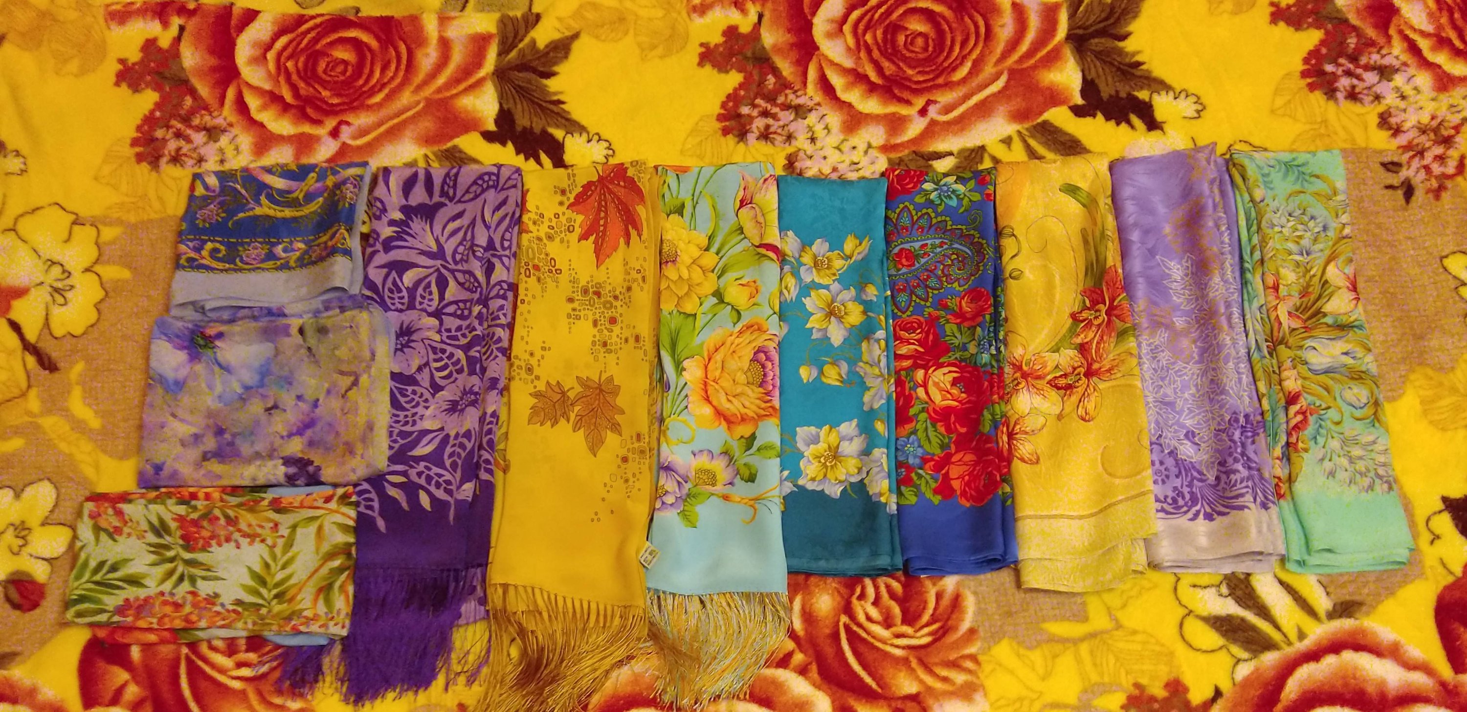Виктория, очень многоцветные платки. Яркие, радостные идёт один позитив!