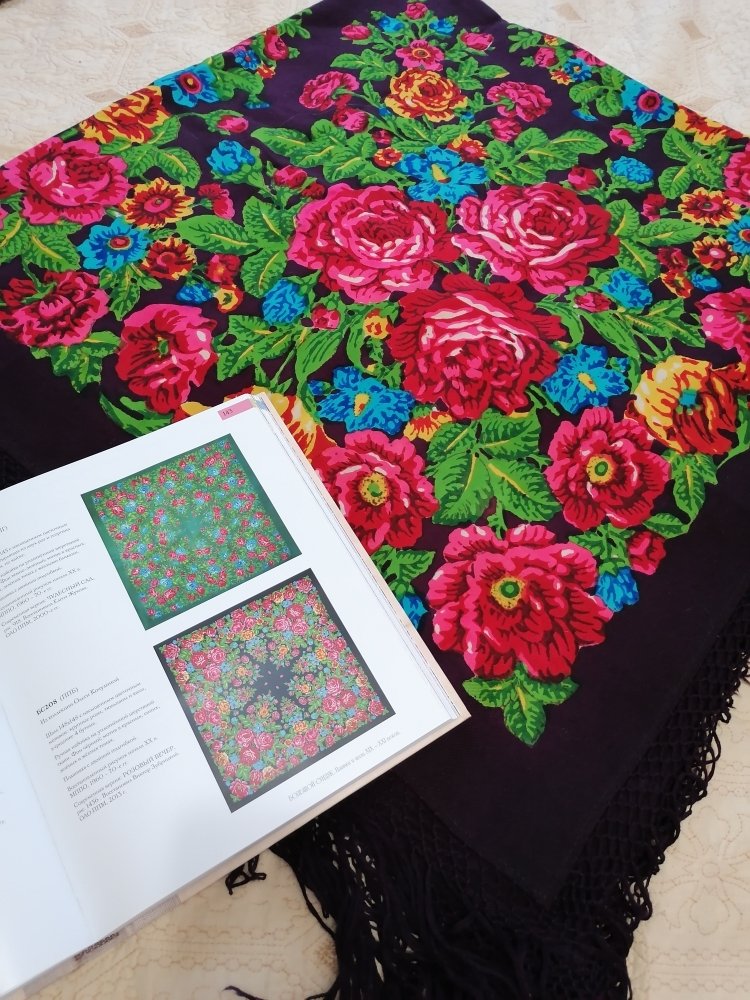 Купила летом старинку, шаль с шерстяной бахромой вязанной клетками, любовалась и вот решила посмотреть чем владею. Хорошо что есть Большой сундук, там все можно найти. Нашла на странице 143. БС 208 современная версия РОЗОВЫЙ ВЕЧЕР, восстановил Виктор Зубрицкий 2013 год. У меня колорит 7 или 8 темное бордо. Этикетки не было. И как раз вчера купила его же 9 колорит. Такой зелени больше нигде не припомню, морская зелень, сочная. сейчас фотками закидаю.