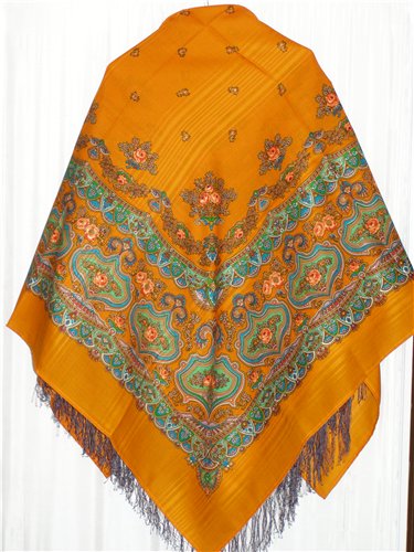 Цвет фона - ветлый, кремовый (никак не горчичный). Цвет каймы - красно-терракотовый (мне напоминает томатный сок :lol: ). Рисунок состоит из небольших букетиков (пять разновидностей насчитала :P ). В букетиках присутствует цвет каймы - удачная перекличка (потому и выбрала этот колорит), стебельки-листики двух оттенков: приглушенный серовато-зеленый и светлый коричневато-зеленый - тоже очень гармонично. Яркости придают голубой (незабудки) и розовый. Но эти цвета присутствуют в рисунке в умеренном количестве и гармонии не нарушают. Без них шаль выглядела бы скучнее. Резюме: очень по душе шалечка пришлась. Жаль, без бахромы!