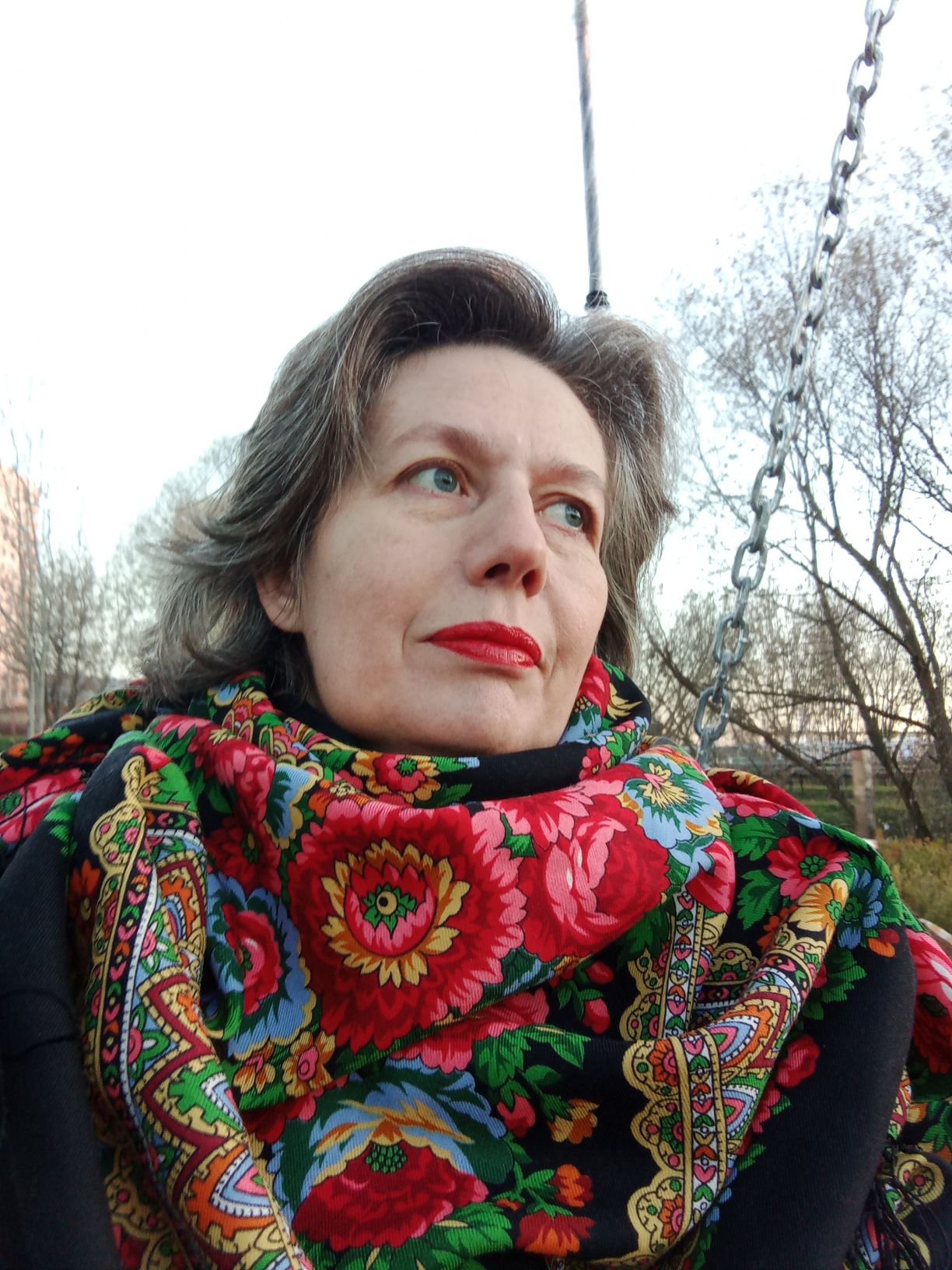 Вот то же самое почти! Тоже полезла смотреть, какая помада была у меня, потому что яркой я бы к этой шали не накрасилась. Но и полностью с советом согласиться не могу, с нюдовой помадой получится действительно утомленная казачка. Мне кажется, нужна средней интенсивности тепловатых оттенков. А Зиночке хорошо и с яркой :: .