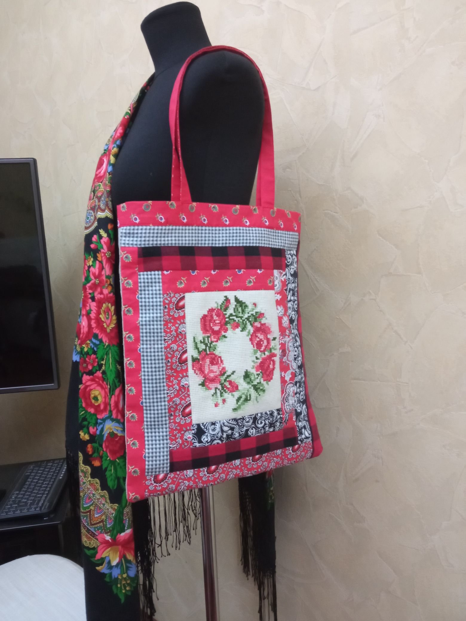 Внезапно сшился лоскутный шопер. С вышивкой по центру. По мотивам прошлогоднего платья.