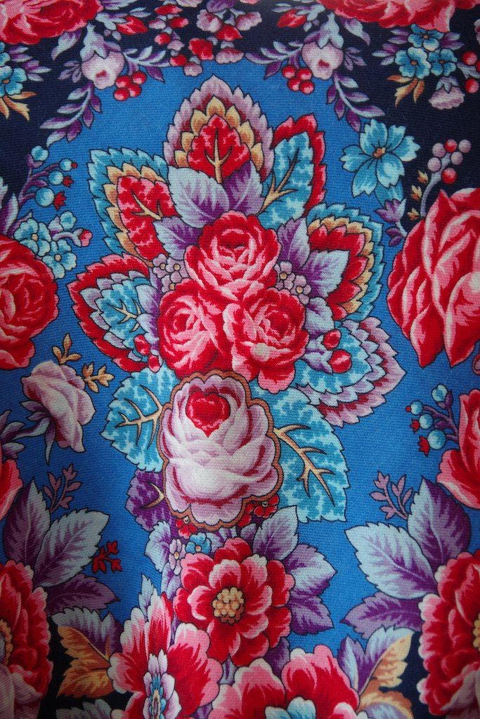 А ещё решила снять фрагменты Когда поёт сердце. В восторге от решения "подсветить" розы голубой каймой (расположены на углах платка, сняла один угол где стоит печать Мануфактуры) и как прекрасны двухцветные листочки!