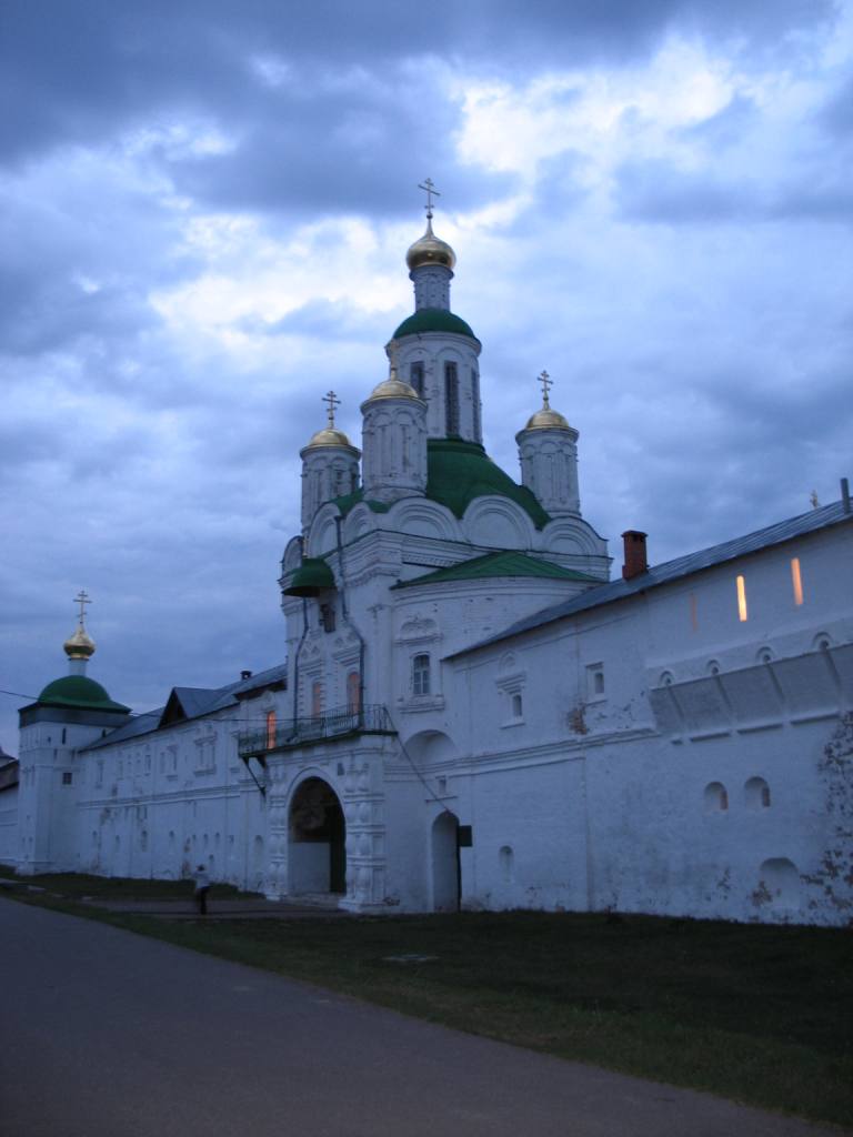 Церковь, где когда-то находилась икона Казанской Божьей матери, была разрушена, сейчас на месте, где она была обретена, стоит памятный знак, идут восстановительные работы. Ватикан вернул ее при условии, что она будет храниться там, где была обретена. Ну, а пока она временно помещается в приспособленном помещении. Макарьевский Желтоводский монастырь с Волги возникает как сказочный город Китеж. Было облачно, но все равно купола блестели серебряным цветом, место для него выбрано исключительное. Сам городок в упадке, но один предприимчивый товарищ открыл страусиную ферму, выращивает еще и павлинов, и фазанов, и редкостных кур, поголовье продает на племя. И теперь туда тоже экскурсии устраивают. Возит на ферму сам хозяин на таком допотопном КАВЗике, знаете, с носиком, дорога наша, российская, словом, небольшой экстрим. Когда видишь ее впервые, аж дух захватывает от такой красоты, настолько неожиданно сочетание внешнего вида и предназначения. А рядом гауптвахта ей в пару. Сюда фото ее уже не пускают, положу в другой раз.