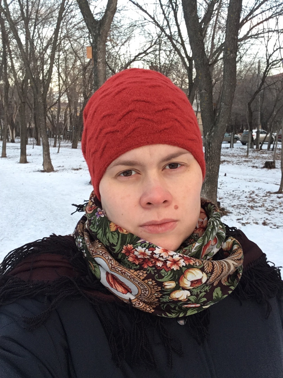 Платочек обожаю, захотелось выделить красные цветы, вроде удалось подобрать шапку близкого оттенка.