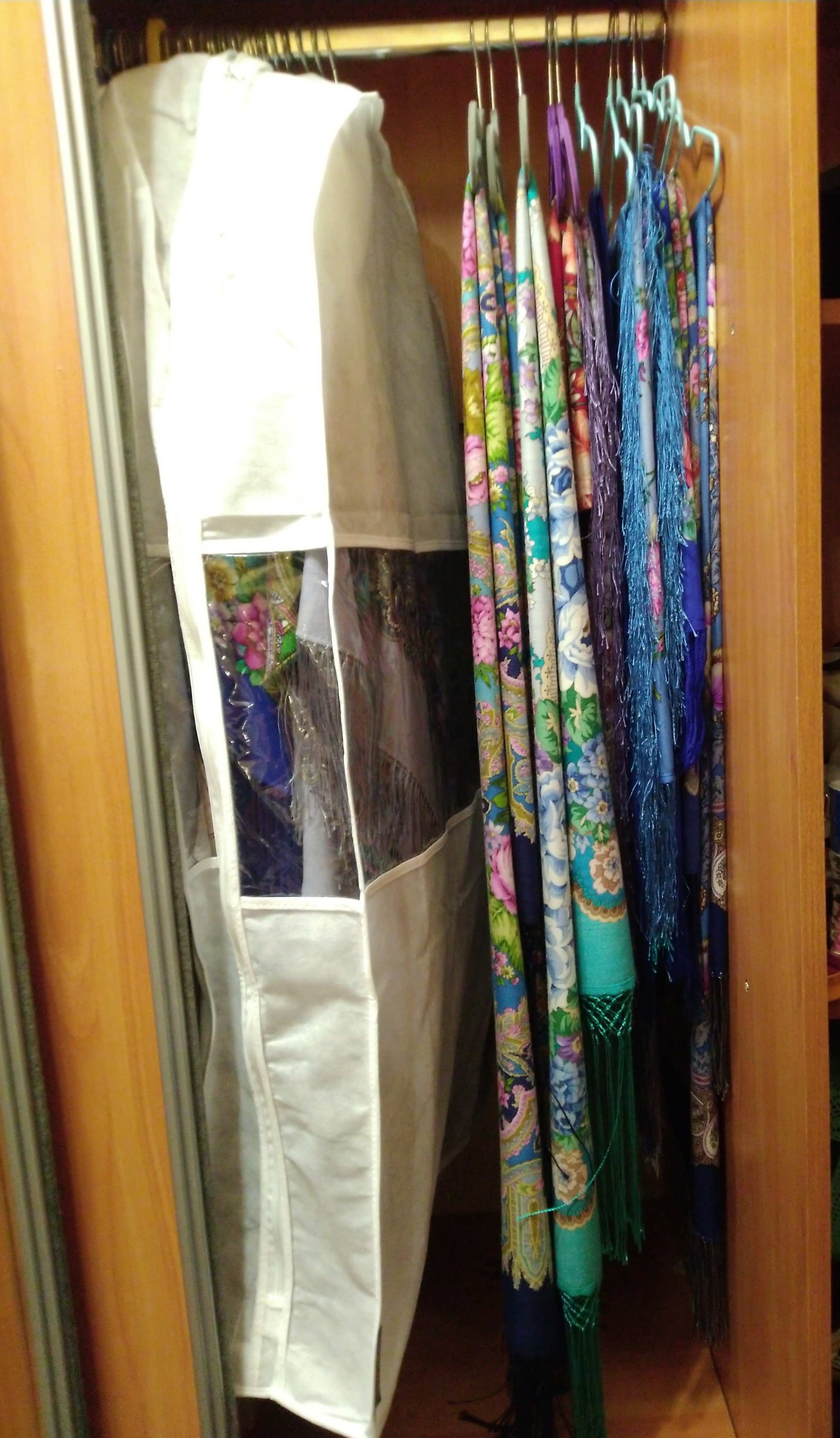 А тут снимаю платок на полюбоваться, в свет выходил один раз, но очень хороший экземпляр яркий, четкий и шерсть хорошая, а там затяжки и выдранная дыра. Сказать что я была в шоке, это ни чего не сказать :o . Убирать все у коробки тоже не хочется - зря что-ли гладила. Купила на валбиресе чехол, в который вставляется много вешалок и теперь у меня там висят платки которые в ходу, как я довольна! От моли спасет вряд-ли, а вот от пыли и механических повреждений вполне.