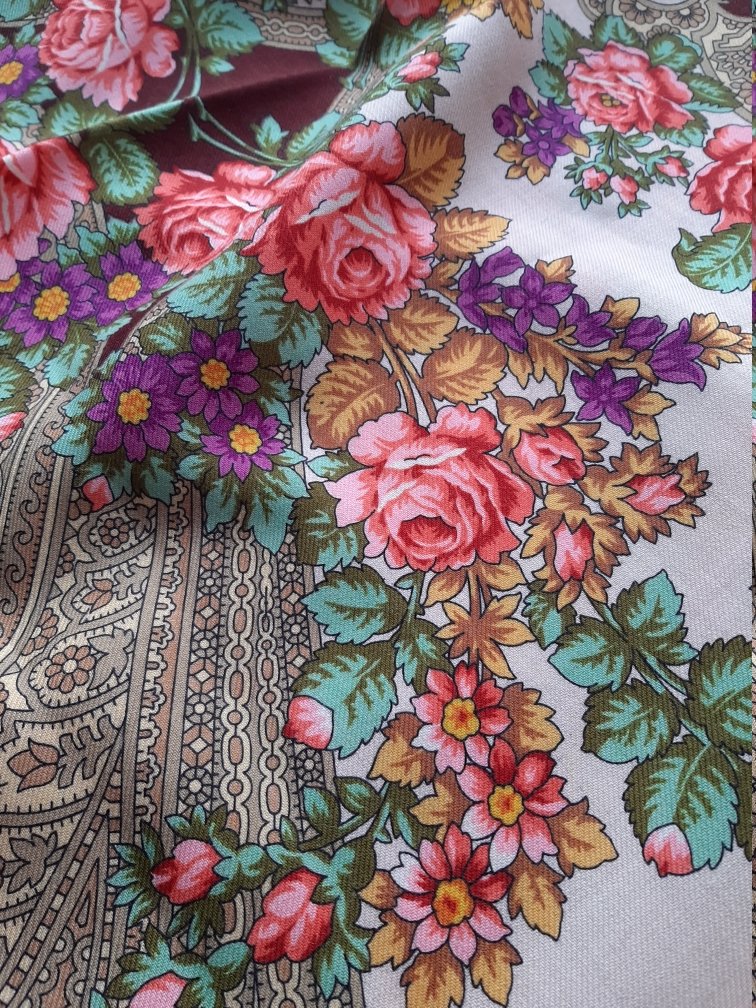 А я с 6-м "Чаиром". На нем бежевый с розовинкой, без желтизны. Пойдет многим. Очень нежная шаль, к ней, наверное, можно подобрать много цветочных духов, она живая. Очень ее украшают не только розы, но и мелкие цветочки, листочки, веточки.