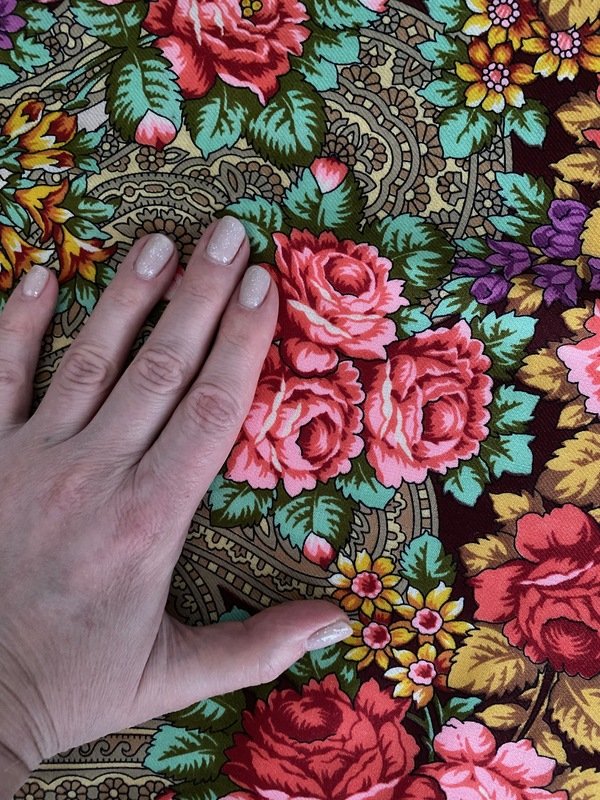 Фото не может передать всей красоты. Как ни поверни шаль! Розы объемные. Пышные головы этих роз на тонких ножках-стеблях ,вызывают сладкое чувство восхищения от прекрасного , (а главное--необходимого)! В сумерках рисунок становится сочнее и резче.