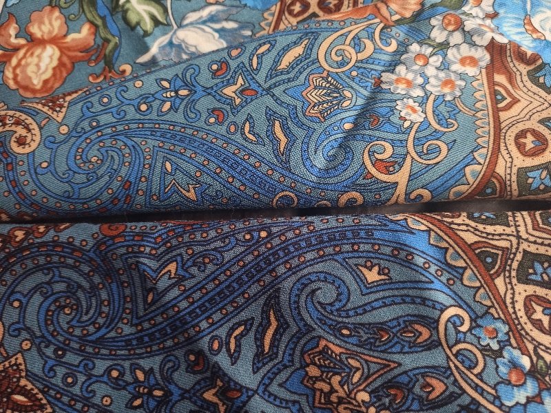 На фото откуда-то появился зеленоватый оттенок, его там нет, ну или почти нет. Основные голубые оттенки на обоих платках, практически, идентичны, разница, кмк, обусловлена качеством ткани. На новом платке ткань шелковистая, на старом - шершавая. За счёт толстого контура старый платок контрастнее там, где цвета одинаковые, но есть и действительные отличия по контрастности, например, в исполнении цветочков, новые немного смазаны. Светлый коричневый цвет на новом немного теплее, зелёный тоже, но в целом платки выглядят одинаковыми.