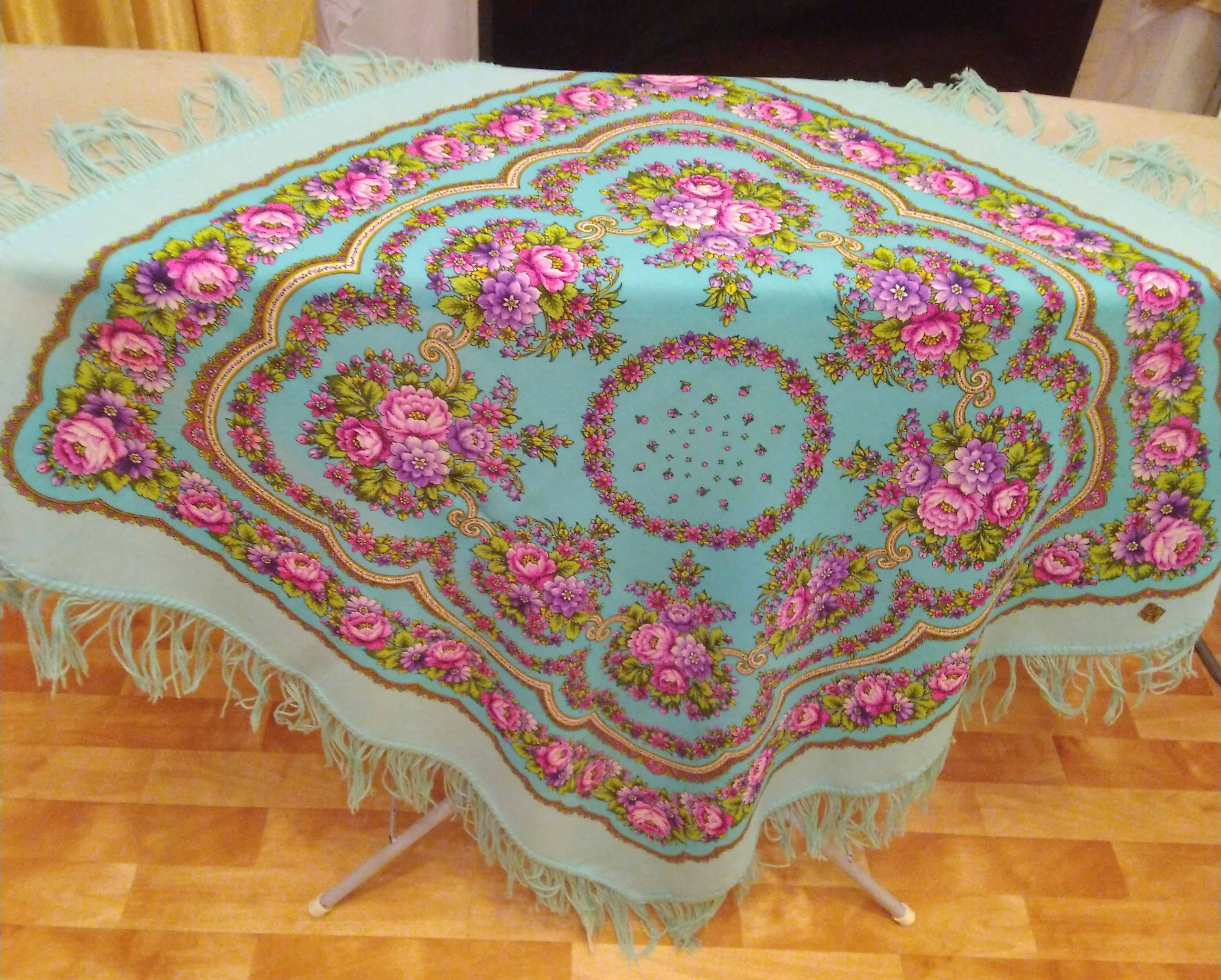Однако, есть два цвета, которые не поддаются правильной цветопередаче: это основной светло-томатный ( или темно-морковный)--тот самый цвет костра ( на камеру выходит ярко желто-красным или почти оранжевым) и зеленый цвет в орнаменте и листиках мелких цветков , предположительно- спараксиса. Если "рыжий" еще немного уловим , то зеленый здесь в реальности-- темная, чистая "бриллиантовая зелень"--зеленка. На фото упрямо получается простая бирюза, поэтому не удалось передать эффект сочетания этих цветов.
