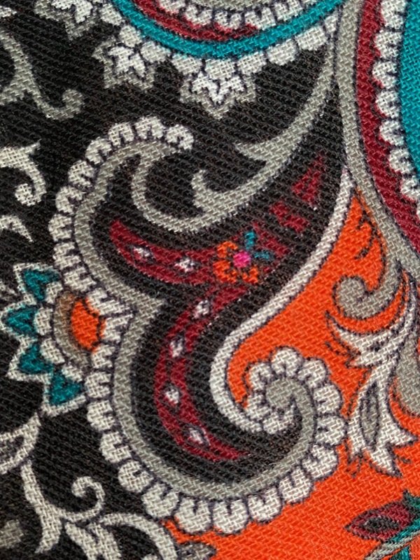 Однако, есть два цвета, которые не поддаются правильной цветопередаче: это основной светло-томатный ( или темно-морковный)--тот самый цвет костра ( на камеру выходит ярко желто-красным или почти оранжевым) и зеленый цвет в орнаменте и листиках мелких цветков , предположительно- спараксиса. Если "рыжий" еще немного уловим , то зеленый здесь в реальности-- темная, чистая "бриллиантовая зелень"--зеленка. На фото упрямо получается простая бирюза, поэтому не удалось передать эффект сочетания этих цветов.