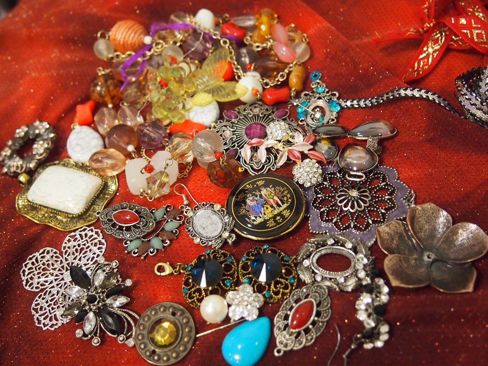 Если у вас, как и у меня хранятся разные ленточки от подарков-тортиков, остатки тесемок, кружева, блестящие лоскуточки, поломанные брошки, рассыпанные бусы,