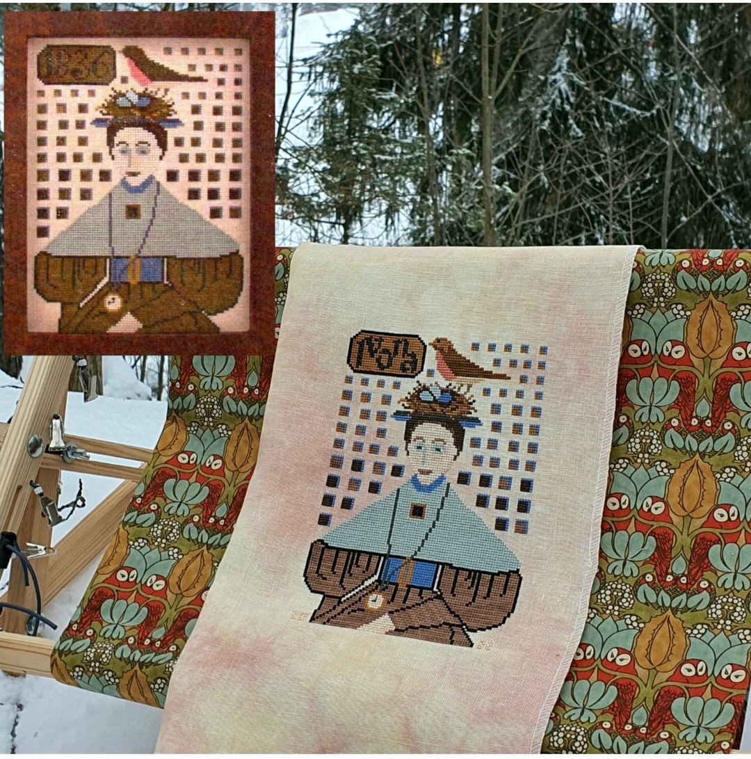 В оригинале там 1836 ( год), я заменила на нужное мне посвящение - "Ivona". Все нитки - подбор из моих запасов (хлопок dmc и ручного окрашивания, бленды) Основа - австрийский лён 30ct, окрашенный вручную. Лицо и кисть руки сначала вышила более тёмным оттенком, но этот "загар" мне совсем не понравился, слишком экзотично)) даже для такого сюжета. Перешила. Самые глазастые смогут разглядеть вышитые цифры 2022