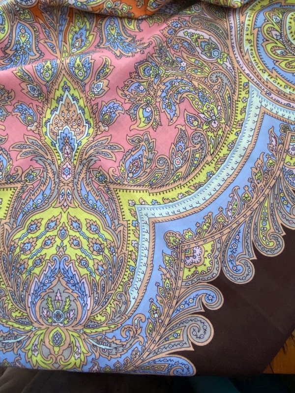 Словесный портрет : светлый, радостный платок, нежный колорит. Ничего фломастерного и неонового. Ассоциации--какие душе угодно... вспомнились манго и драконий фрукт. Понравилось сочетание "темной рамки" каймы с такой светлой серединой--нет эффекта зефирности.
