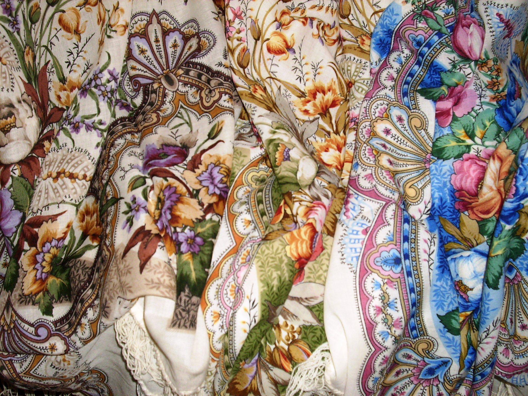 "Розы на снегу", "Отрада" с бурыми фестонами, а также поплиновая шаль 70-х гг. прошлого века (т.н. павловопосадский хлопок).