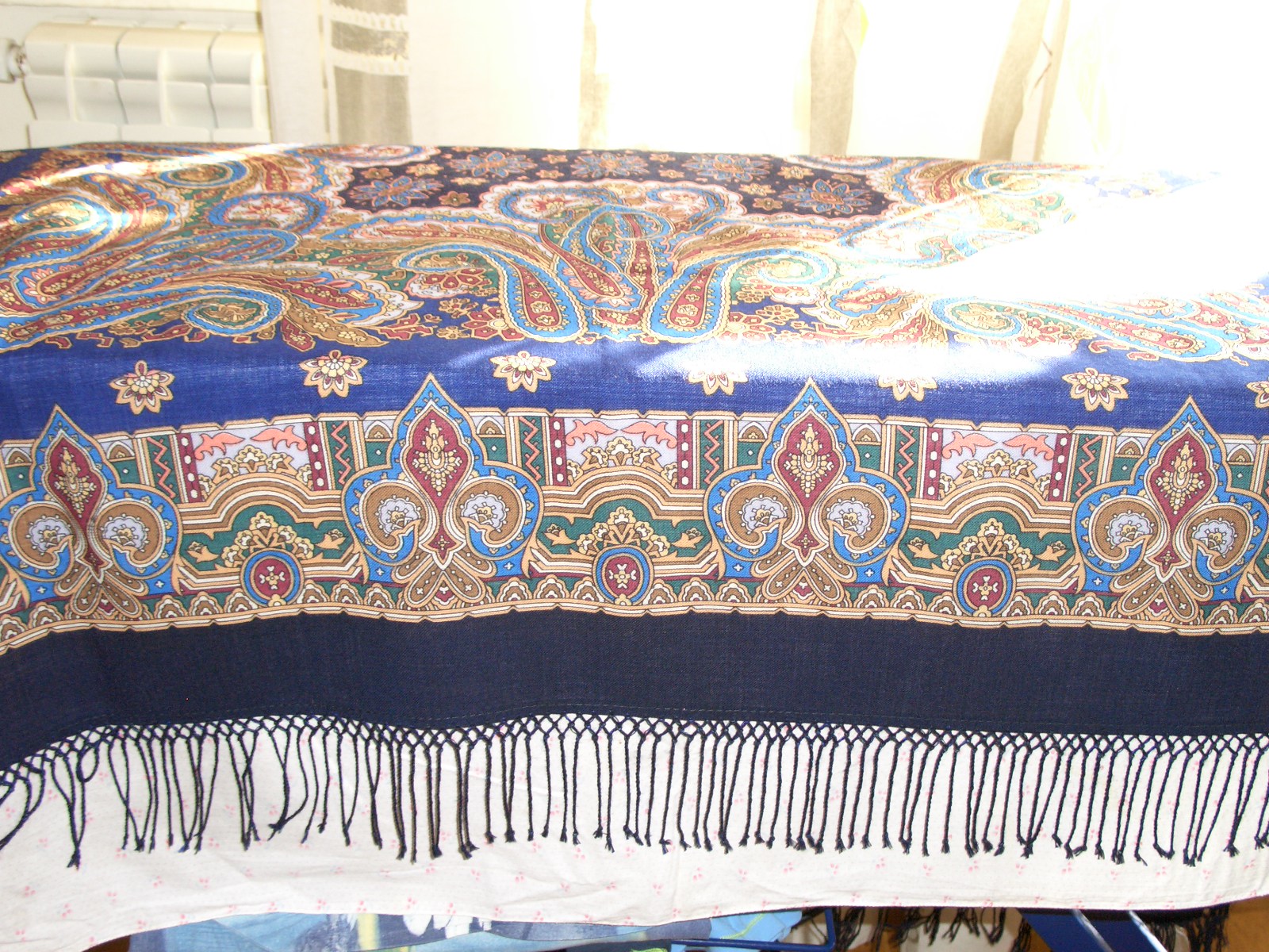 И еще. Хочу заметить, что в данном случае бахрома ведет себя как БАХРОМА, а не как мех из шерсти - потряхивается при ходьбе, не слишком сильно спутывается, вокруг платка создает легкую "дымку", т.е. плавный переход от каймы в бесконечность.