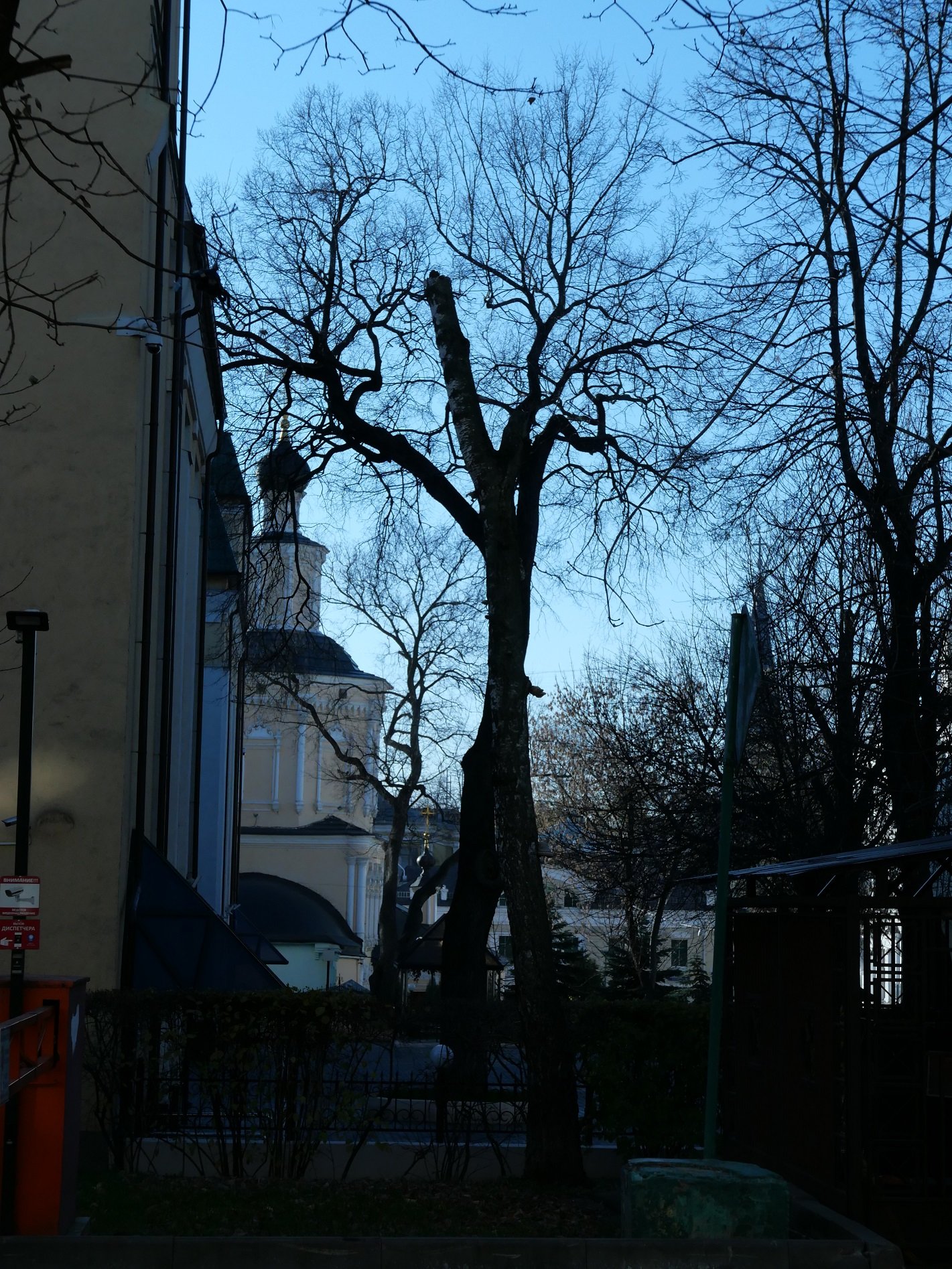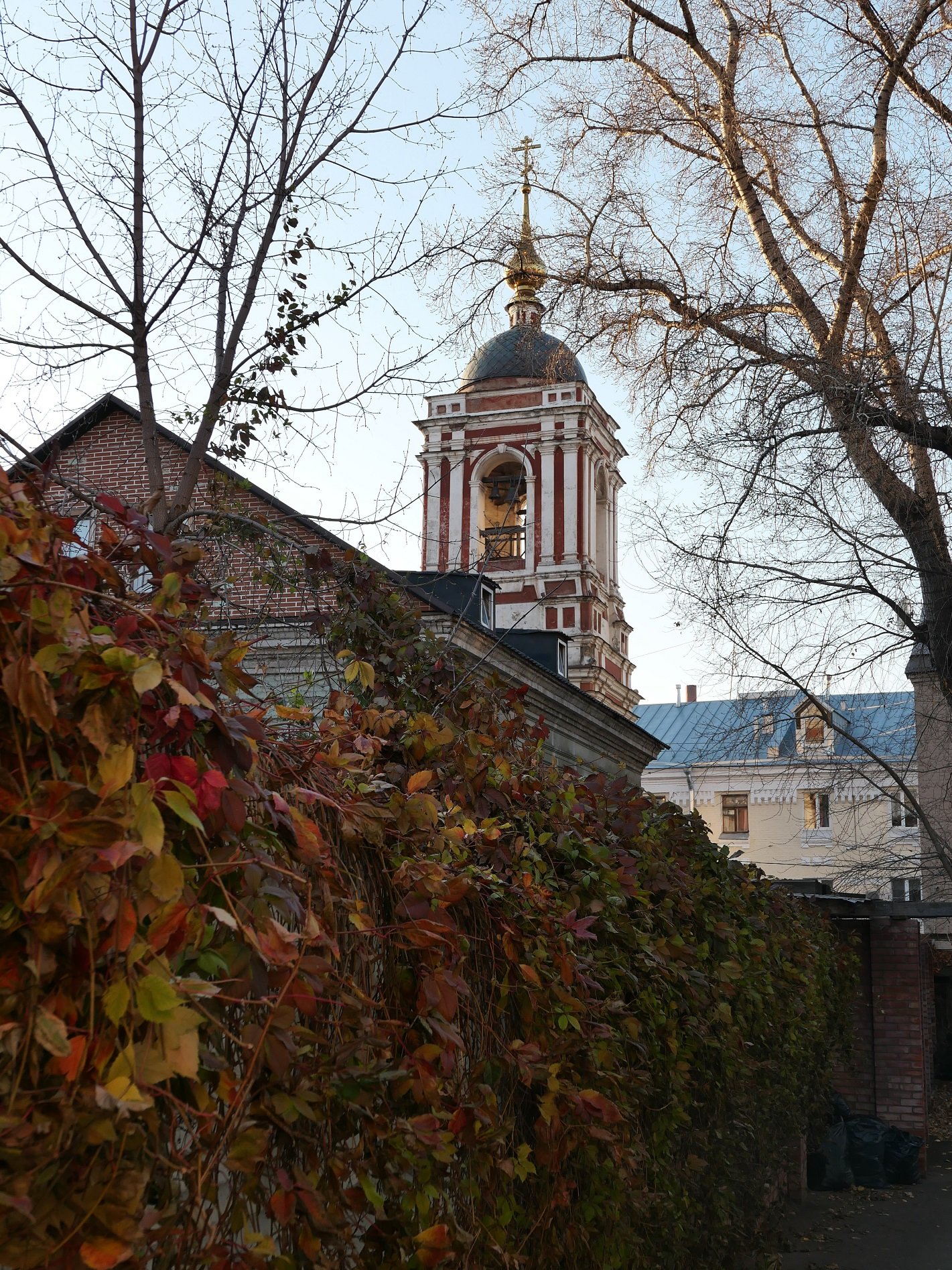 В один из двориков мы зашли посмотреть декор 17 века, удивительно, но в этих особнячках еще живут обычные люди и вовсе не собираются отсюда переезжать. Они, собственно, и открыли этот декор и изразцы. Напоминаю, это был последний день октября, солнце клонилось к закату, и в его лучах таинственно смотрелась из дворика церковь Николы в Подкопаях.