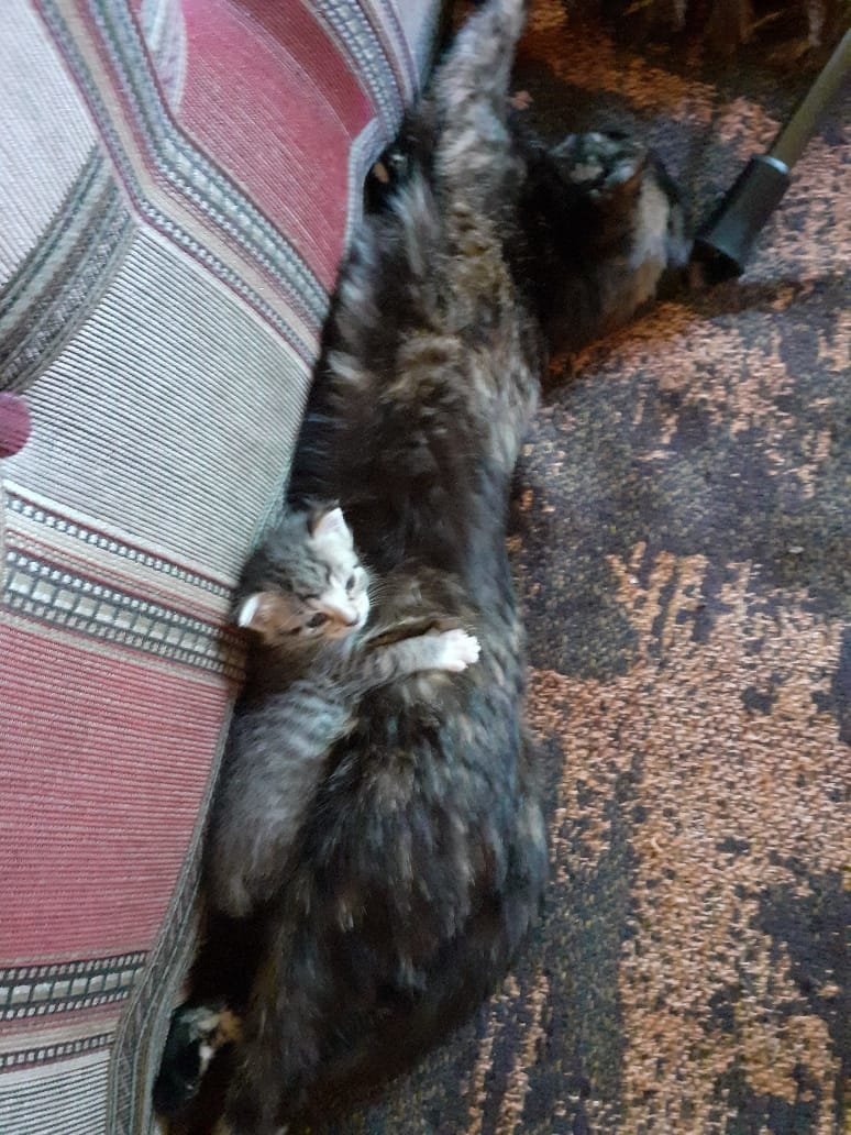 Таня, у бабушки в деревне есть кошечка Соня, похожая немного на вашу. Сын гостит там и наблюдает за становлением её материнства, так сказать. Кошка кормит и всё время вылизывает своё "чадо". Это её первый котёнок. Тоже повезло ему, оставили.