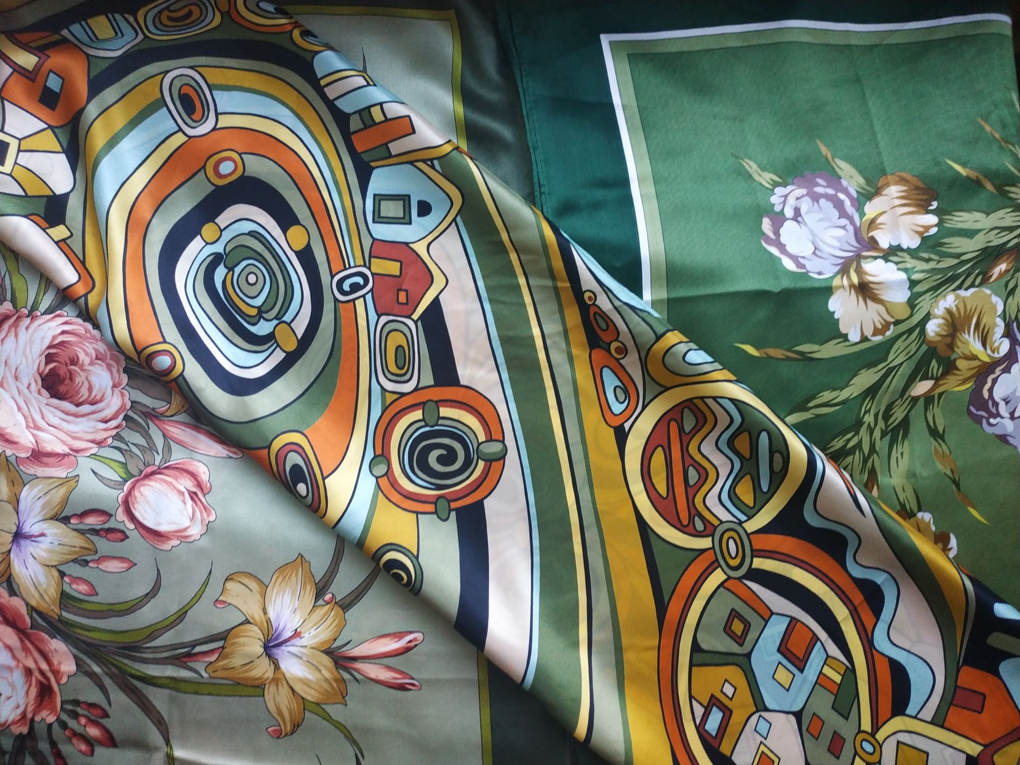 сравнение при дневном свете шелковых атласных платочков разных оттенков зелени