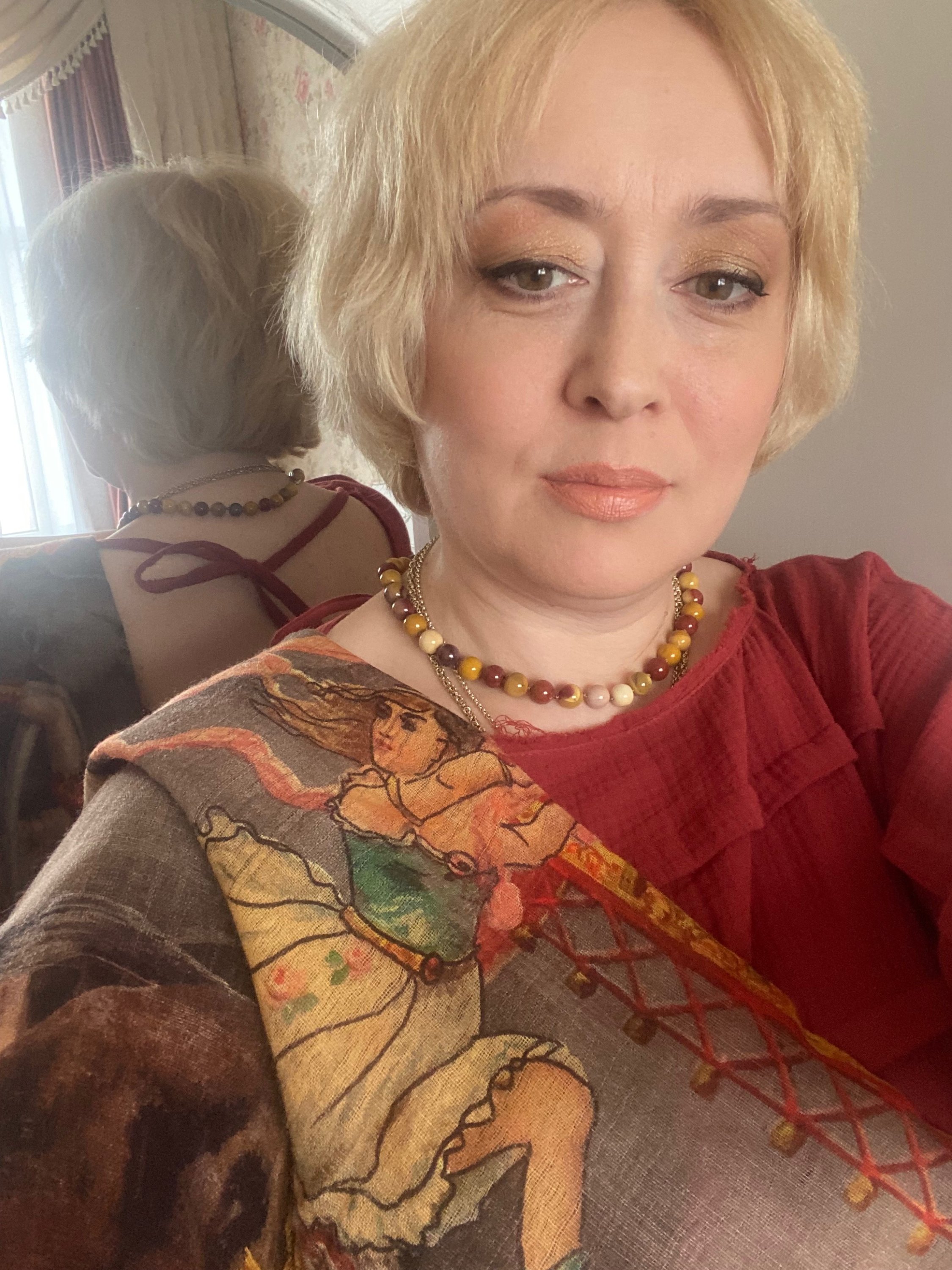 Как женственно - всё в унисон: и палантин, и бусы, и блузка! И вы такая очаровательная! Прелесть!